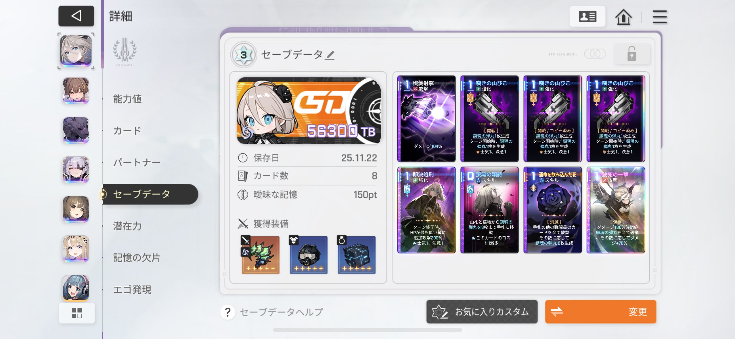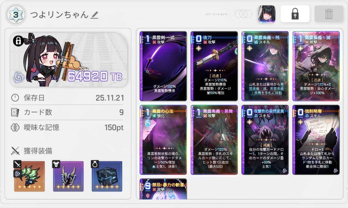 | … | 11625/11/22(土)00:23:02No.1374905704+能力でドロー時効果の装備付けまくったニアちゃん回してて気持ちよさそうだけどニアちゃんで攻撃やシールド貼ってもそんなに強くないか... |