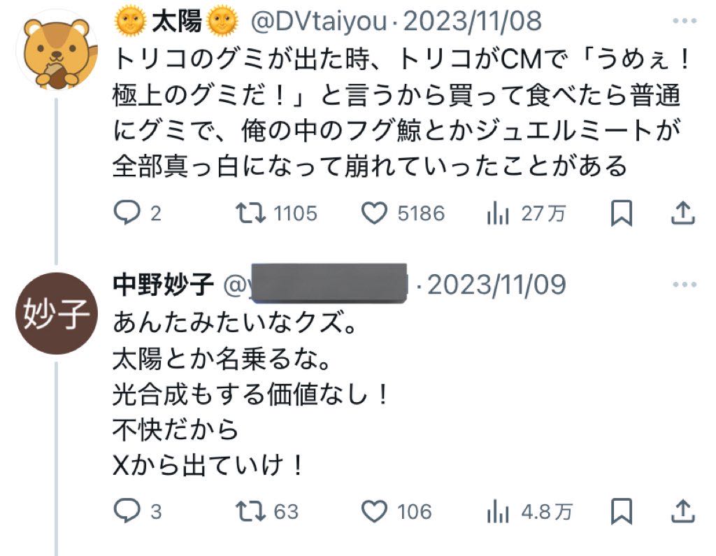 | … | 325/11/22(土)20:56:27No.1375160261そうだねx1トリコアンチは過激だな… |