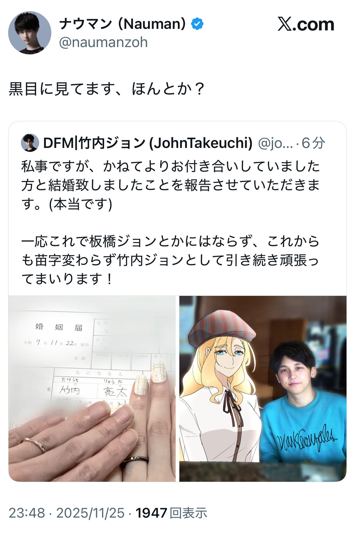 | … | 1025/11/25(火)23:51:27No.1376276585そうだねx24本当に結婚したのかどうか分からないの怖いんだよね… |