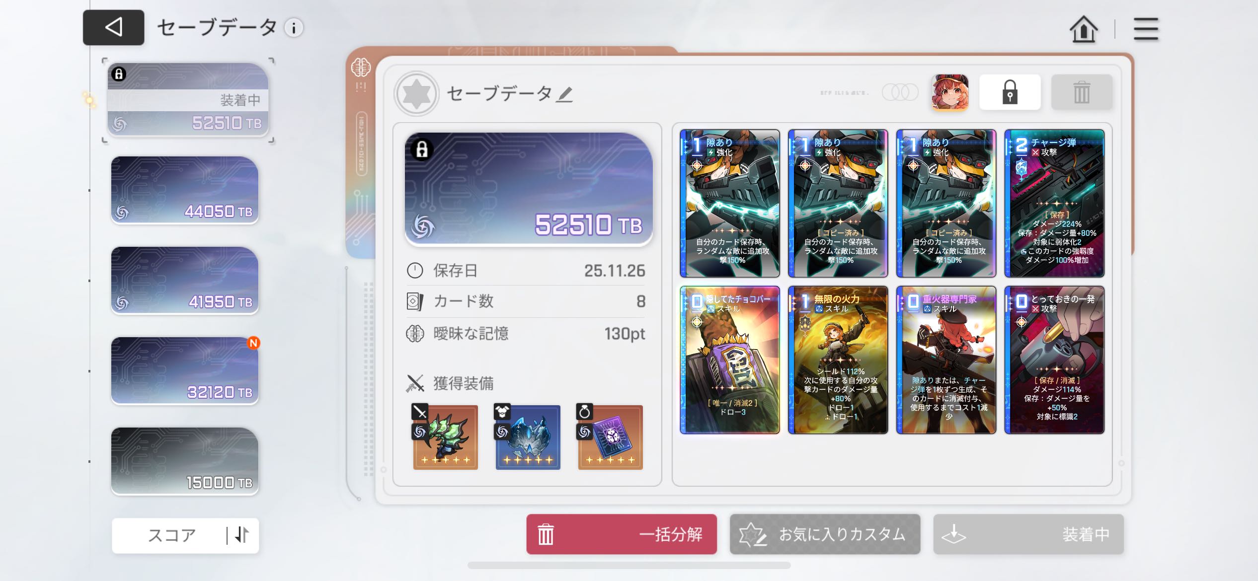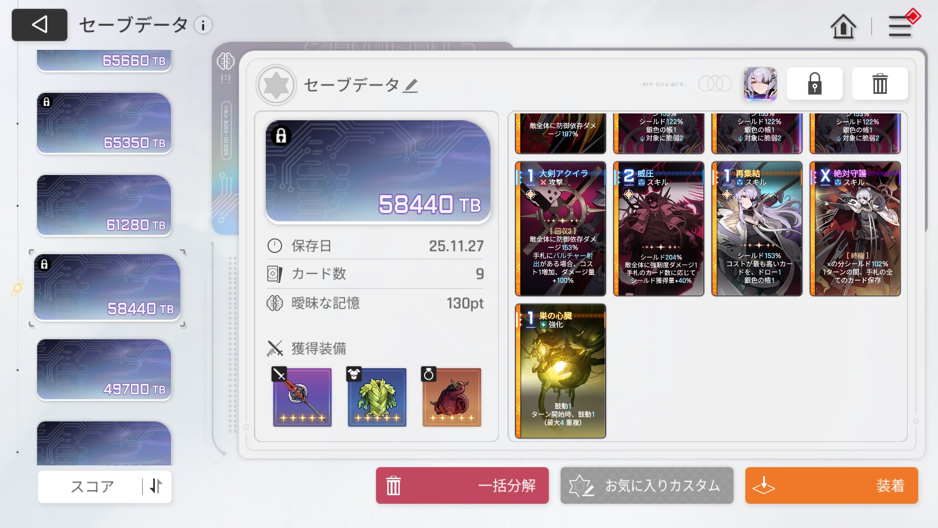 | … | 3125/11/27(木)00:36:37 ID:rkwpa.zQNo.1376604848+>コデックスで毎ターンカード1枚破棄のデバフ初めて選んだけどこれやっぱお排泄物でございます… |