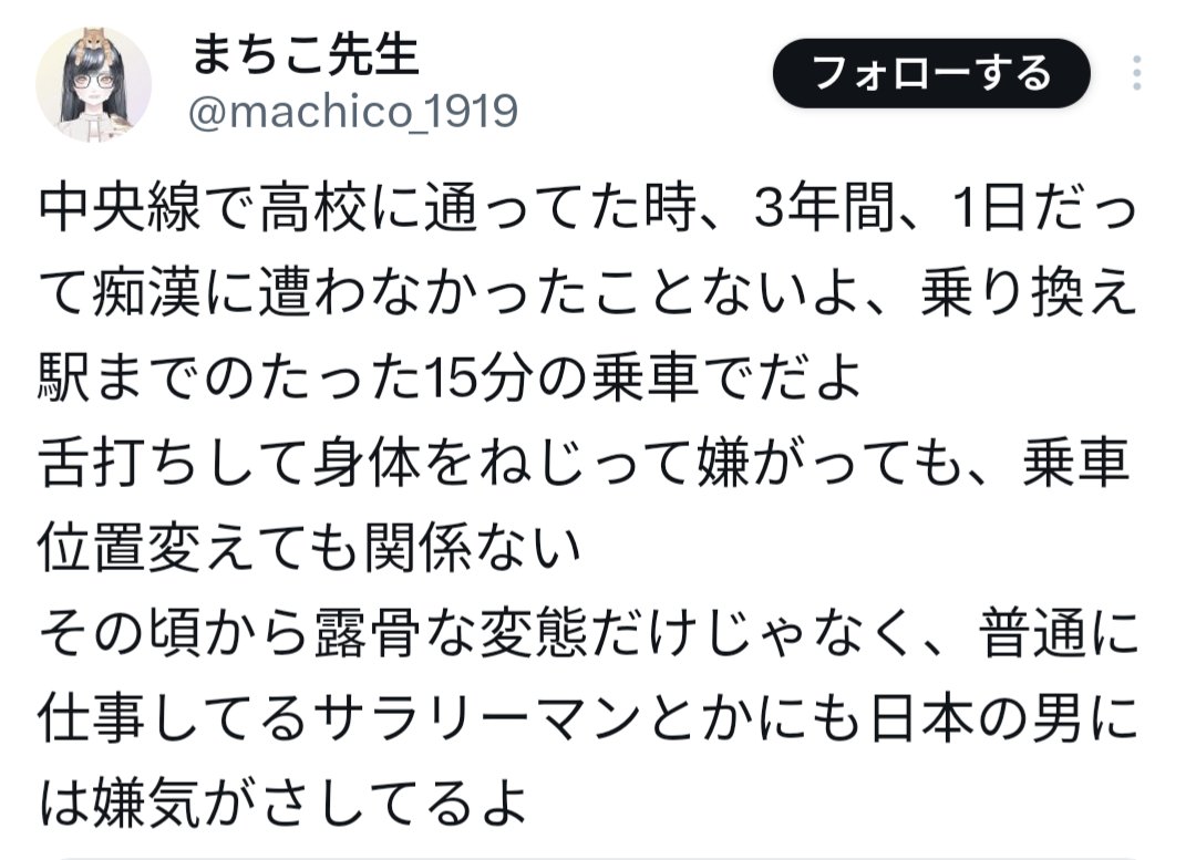 | … | 12825/11/28(金)09:57:27No.1376971798+>なんか時々女で電車通学なら数回は痴漢されてて〜みたいな世界観で生きてる人がいてそれに同意してる人がいるのも見るんだけどなんか…違う世界に生きている…? |