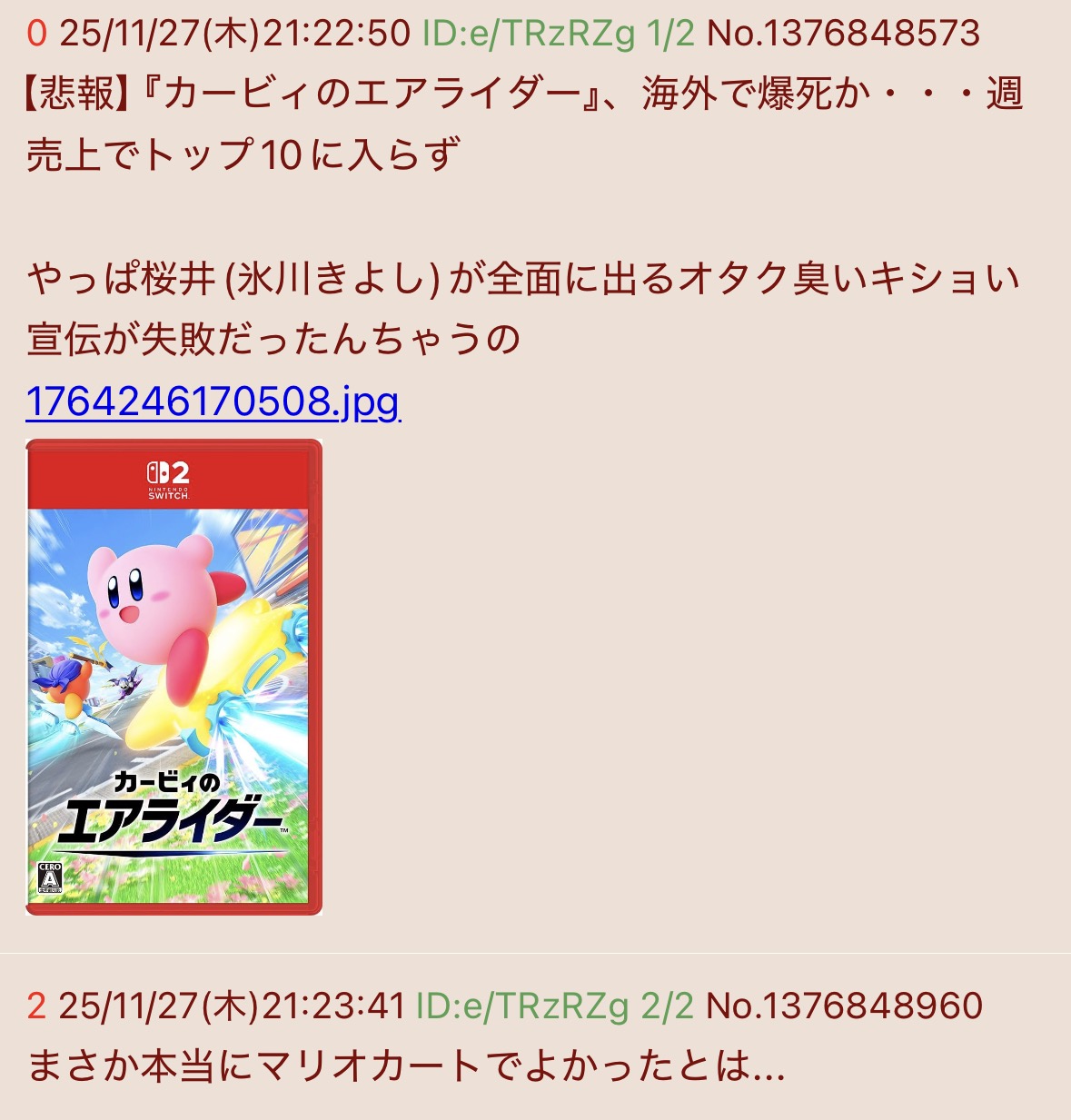 【悲報】『カービィのエアライダー』、海外で爆死か・・・週売上でトップ10に入らずこのスレは古いので、もうすぐ消えます。