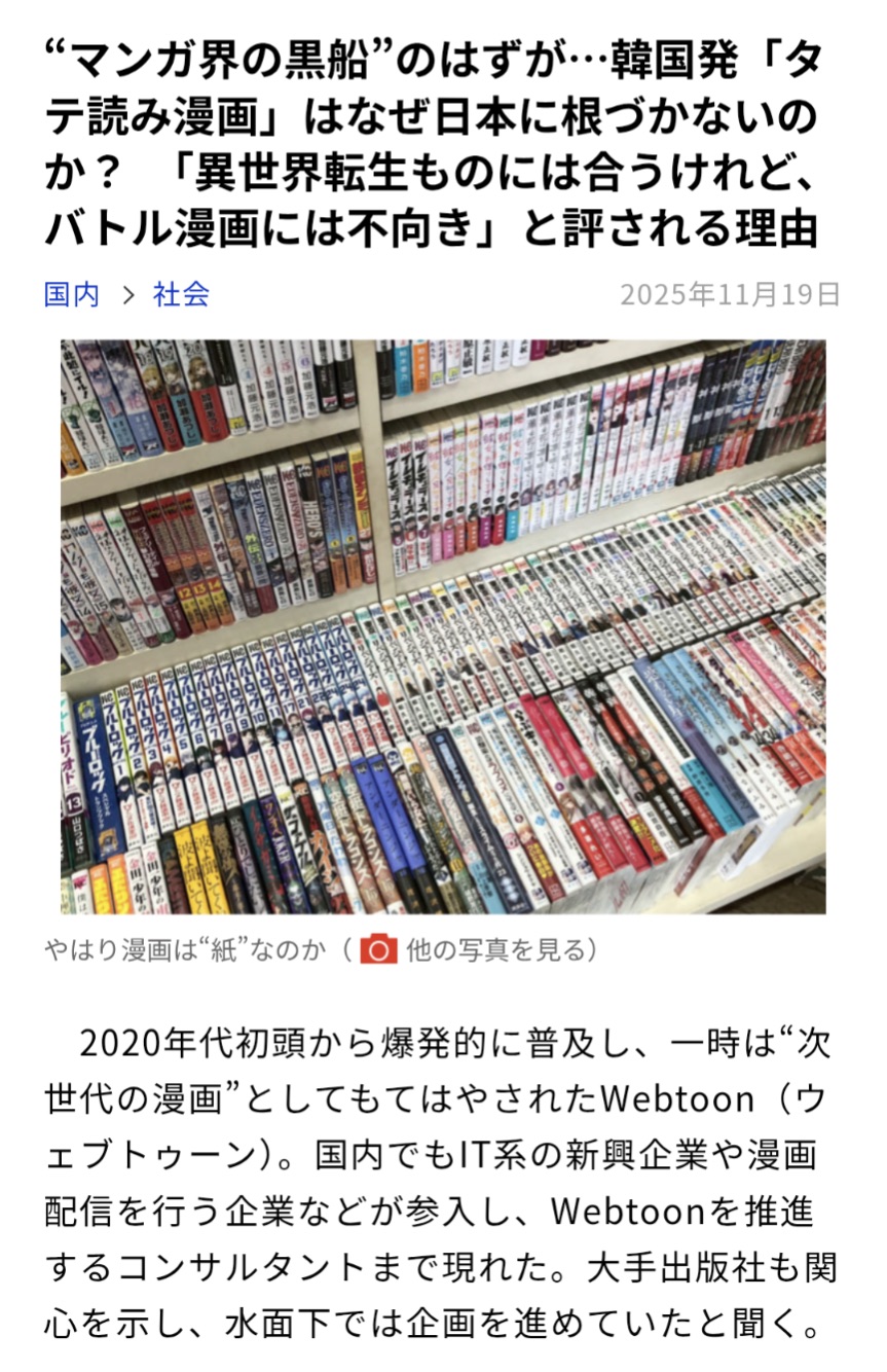 | … | 425/12/01(月)16:39:43No.1378149192+韓国の漫画俺がなんとかレベルアップって奴だけ漫画喫茶に置いてるな |