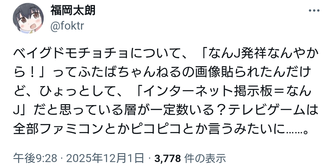 | … | 2025/12/01(月)22:35:20No.1378287720そうだねx20「にちゃん」という響きに慣れ親しみすぎたせいか「ごちゃん」の違和感がすごい |