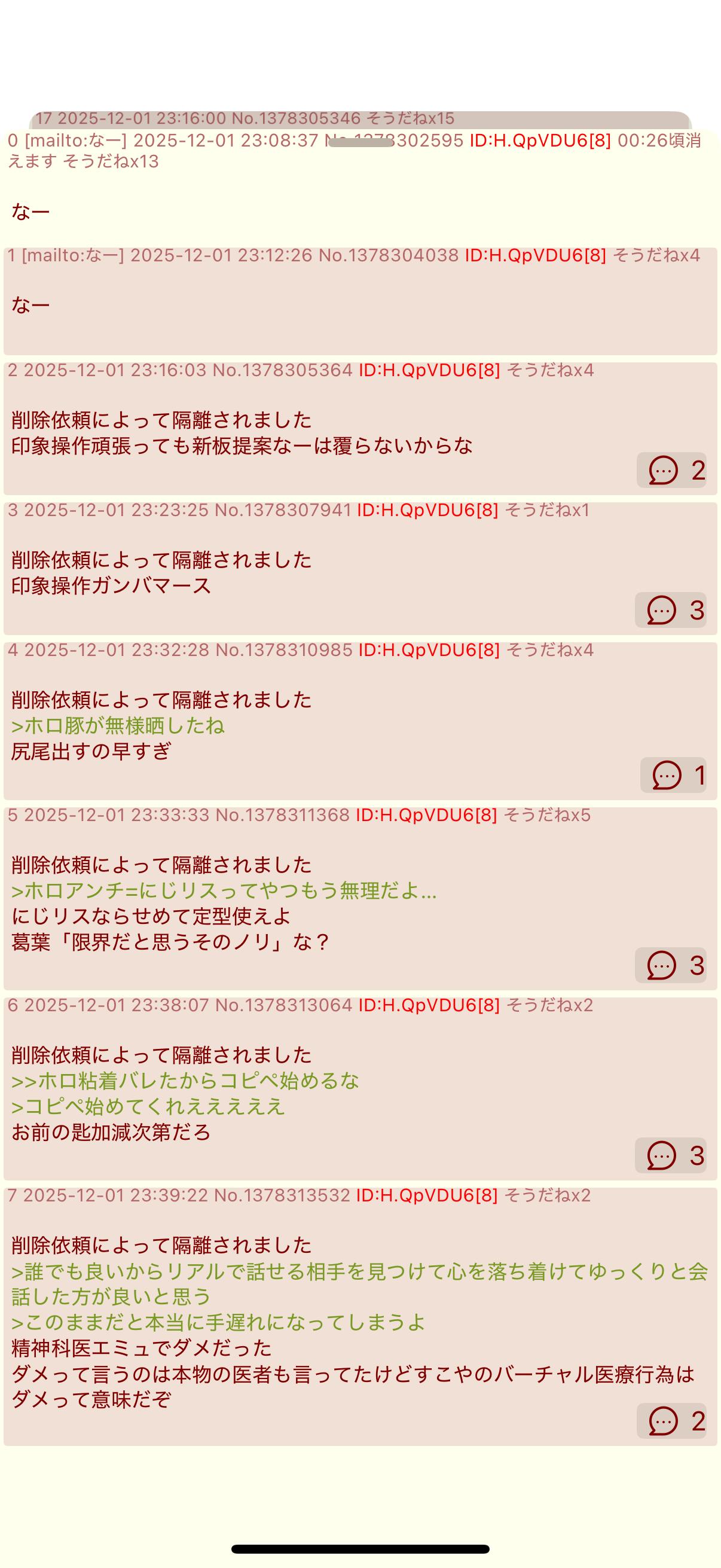 | … | 5025/12/02(火)00:27:16No.1378331268そうだねx9>>ホロリス「荒らしが酷いのでホロ板作って」→ホロ板設立 |