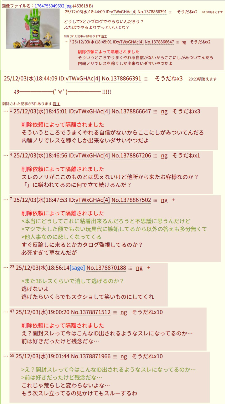 | … | 7825/12/04(木)00:52:55No.1378987288そうだねx10やたら無視云々ってほざいてるが |