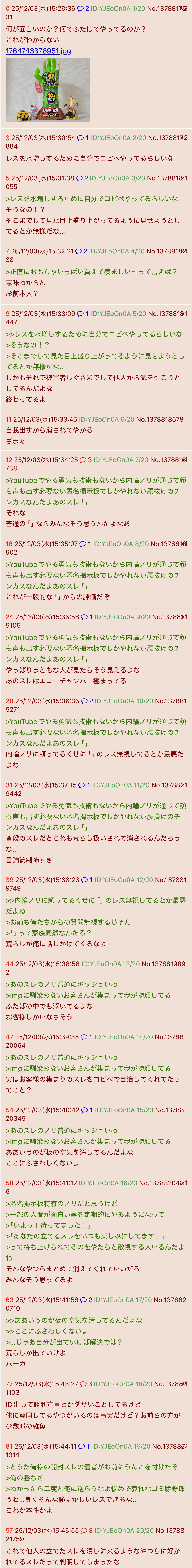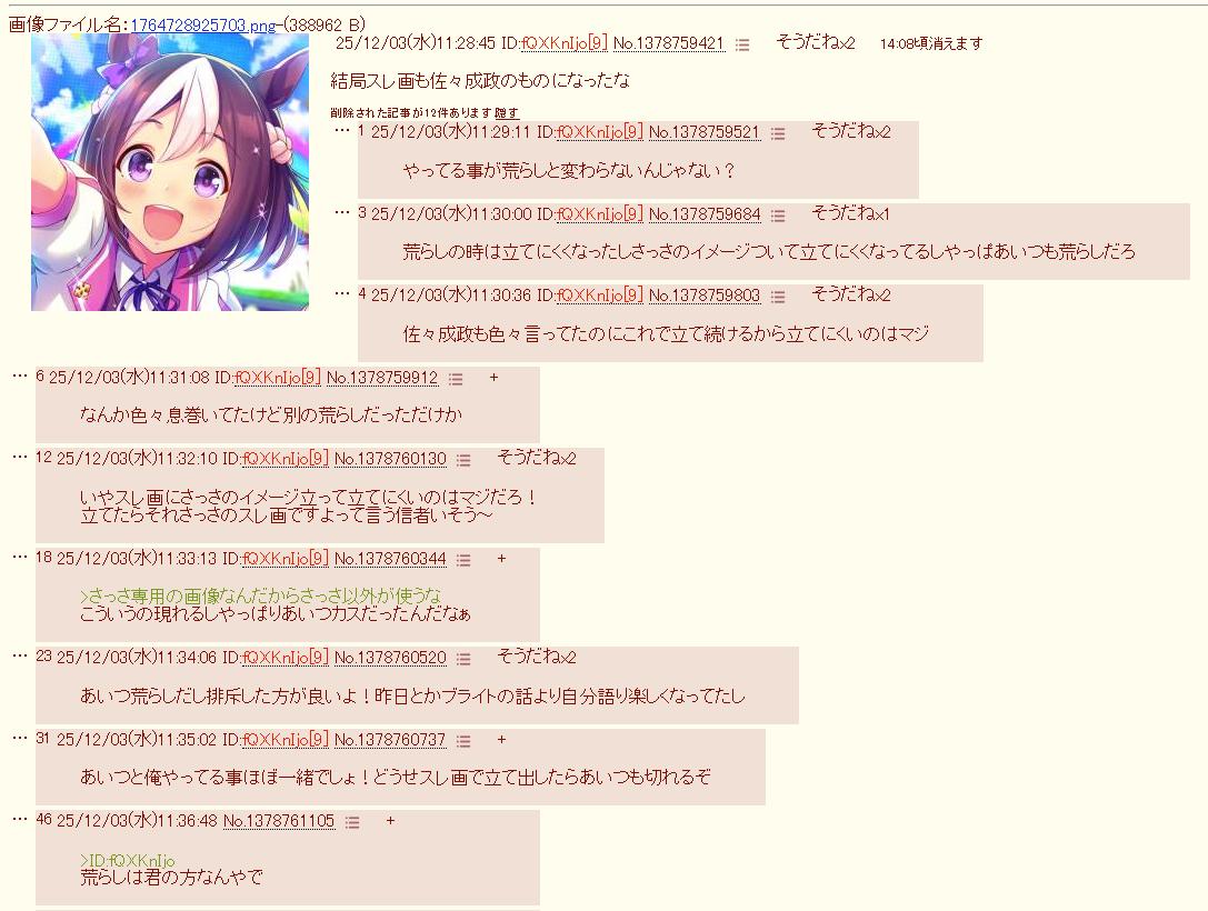 | … | 525/12/04(木)00:39:29No.1378984041そうだねx11>毎日毎日imgで構ってもらうために人様の画像使ってスレ立て続けるのおかしくね? |