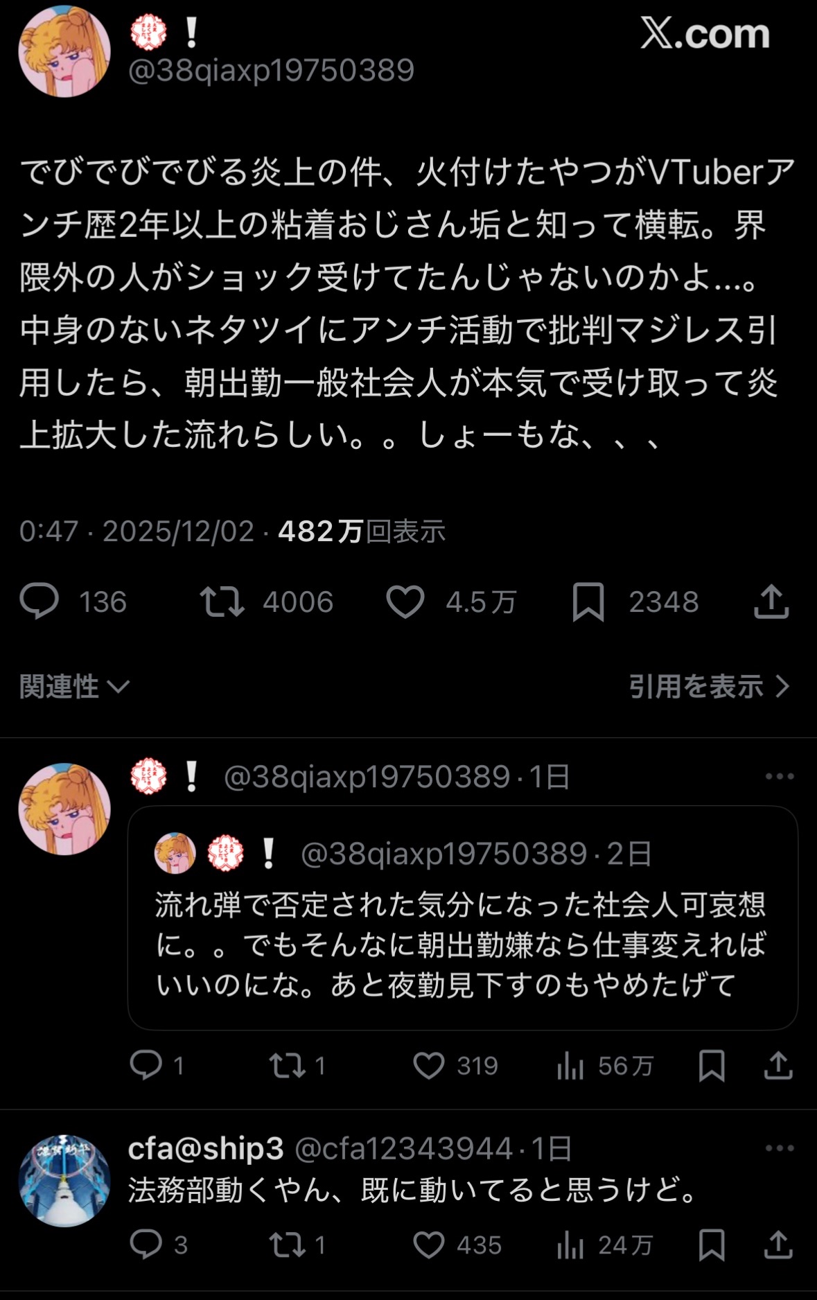 | … | 8825/12/04(木)07:27:10No.1379015556そうだねx12元ポスト消してないんだから当初の予定通り自分で仕掛けた炎上を楽しんでるんでしょ? |