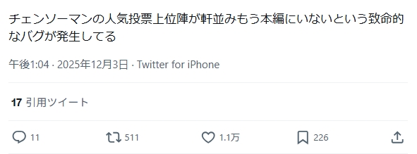 今週のチェンソーマン正直めちゃくちゃ好きこのスレは古いので、もうすぐ消えます。