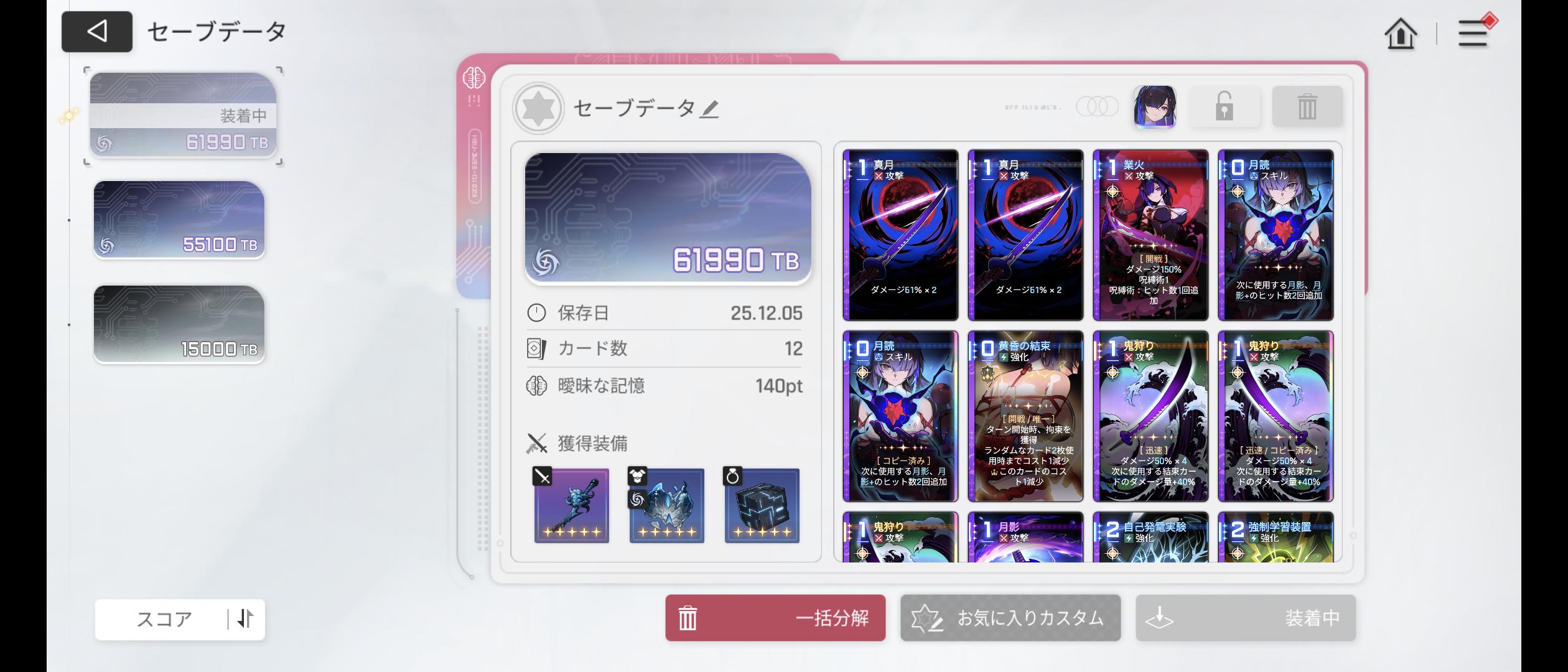 | … | 6225/12/05(金)03:24:49 ID:rOft/w3.No.1379323622+>チズル月影+最大ブッパに特化するより鬼狩りを真月生成にして劣化メイリン運用の方が強い気がしてきた |