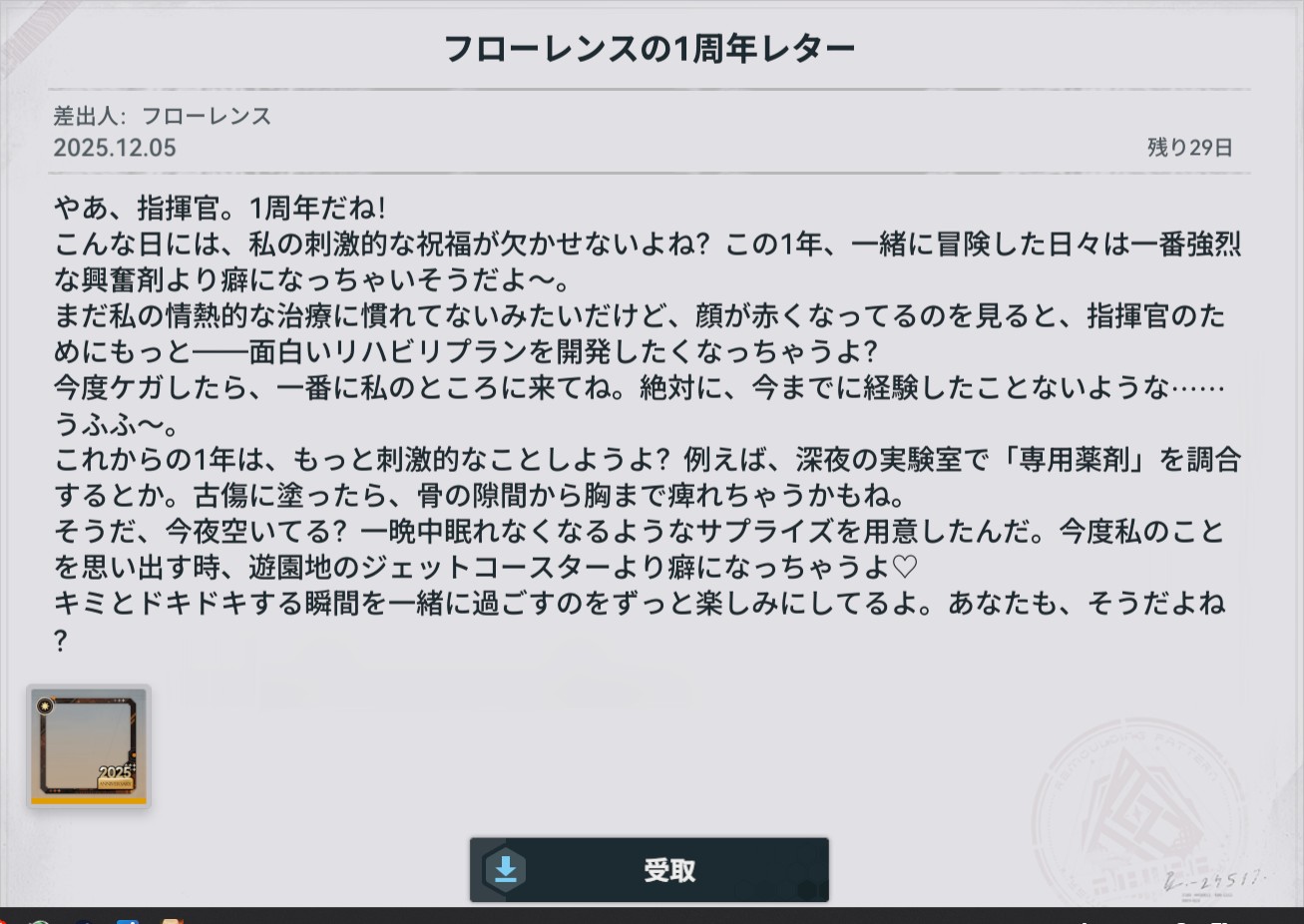 | … | 33025/12/05(金)10:04:22No.1379359643そうだねx1>大物が来たわね❤️を忘れてはいけない 翻訳というかただの設定ミスだし… それはそれとしてボイスついてないところの翻訳は怪しいとこ多いけど |