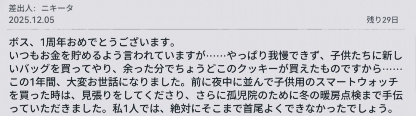 | … | 25125/12/05(金)09:41:21No.1379355471+誰から手紙もらうか選ぶの忘れた結果手紙もらえなかったけど こっちも16姉宛の手紙書いたからイーブンか… |