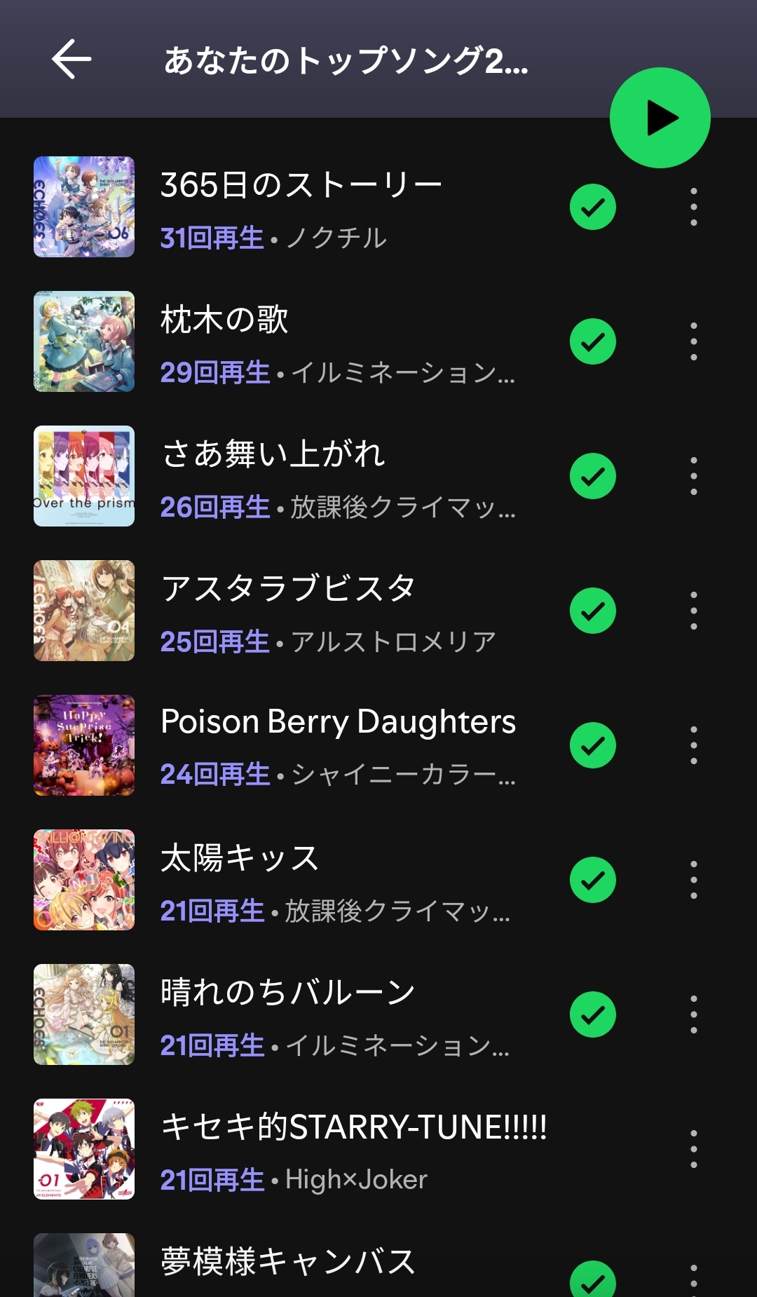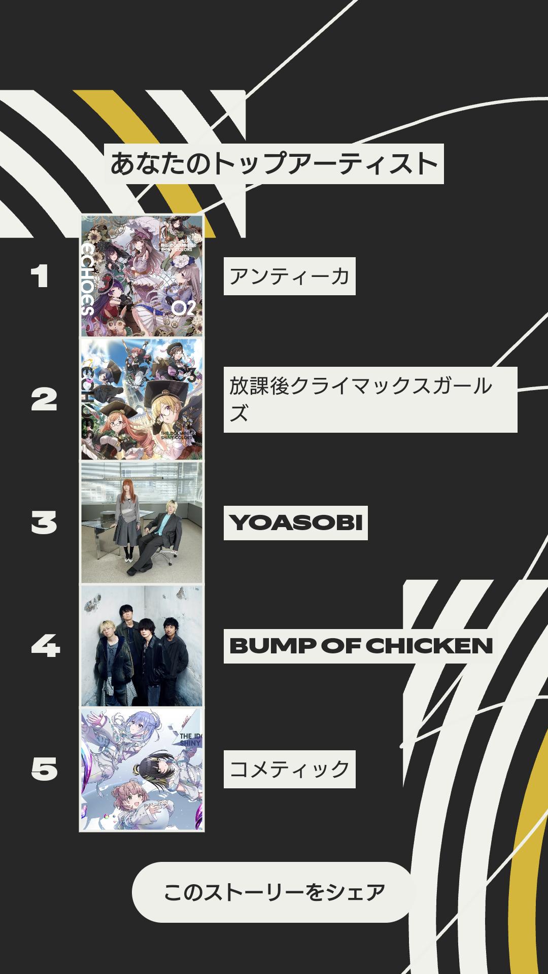 | … | 4325/12/05(金)13:48:48No.1379411952+曲はアイマス関係無いのがトップだったけどアーティスト単位だとこんな感じだった |