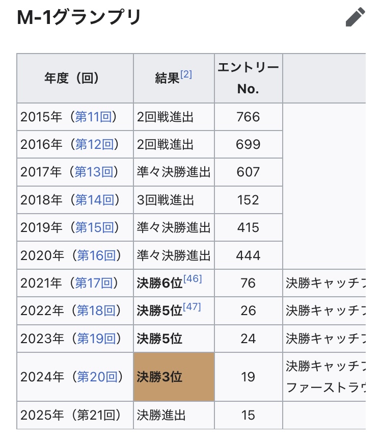 笑い飯以来2組目の5年連続ストレート(準決勝で敗退無し)でM-1決勝進出したコンビ貼る