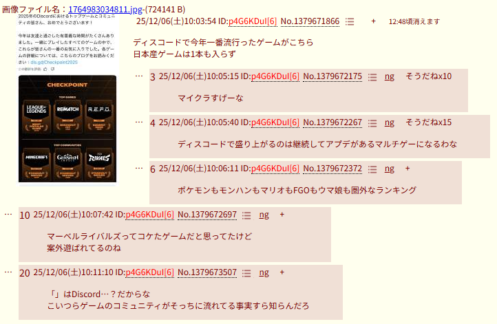 | … | 17825/12/06(土)11:29:27No.1379692548+ディスコードで盛り上がるのは継続してアプデがあるマルチゲーになるわな |