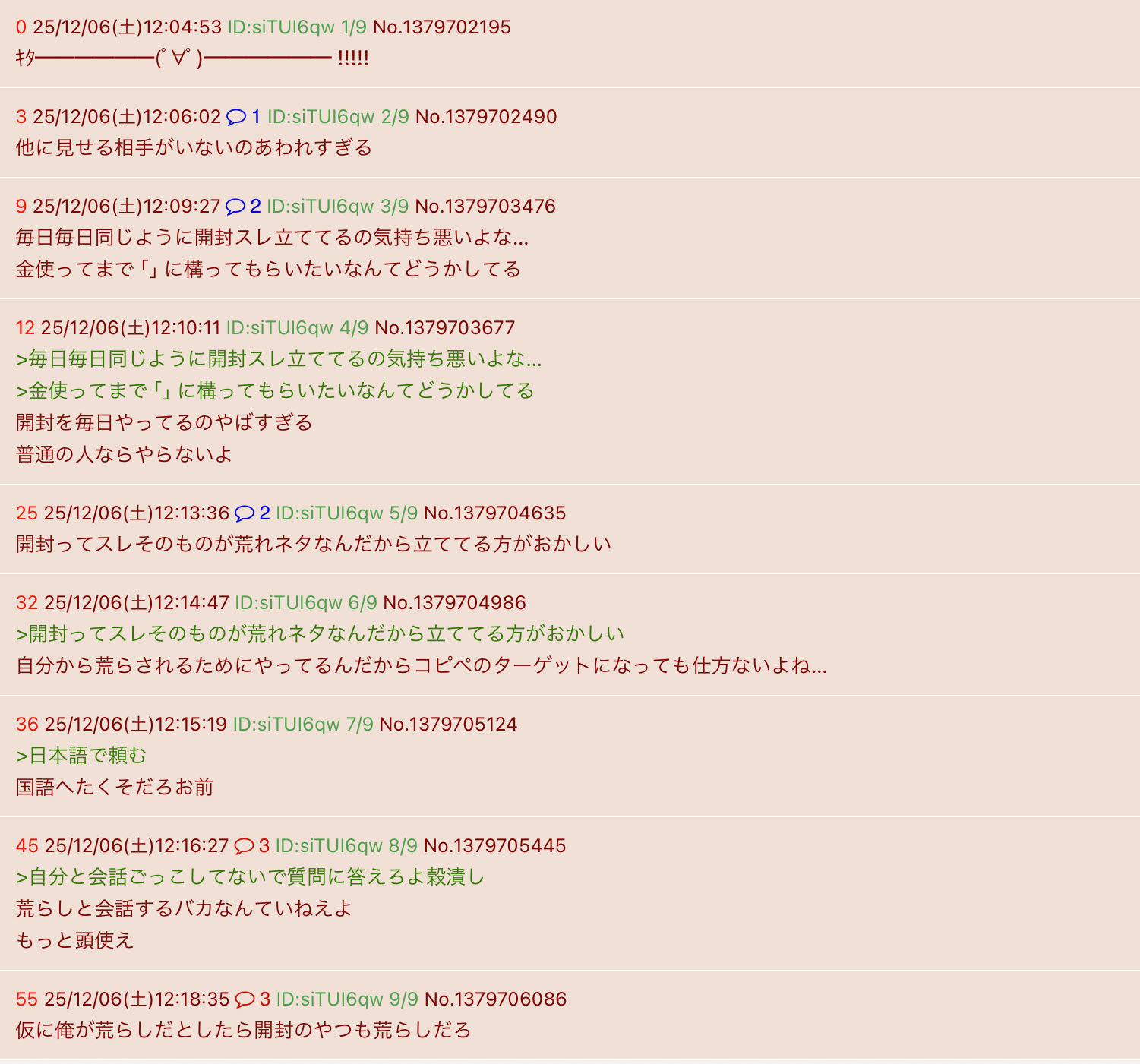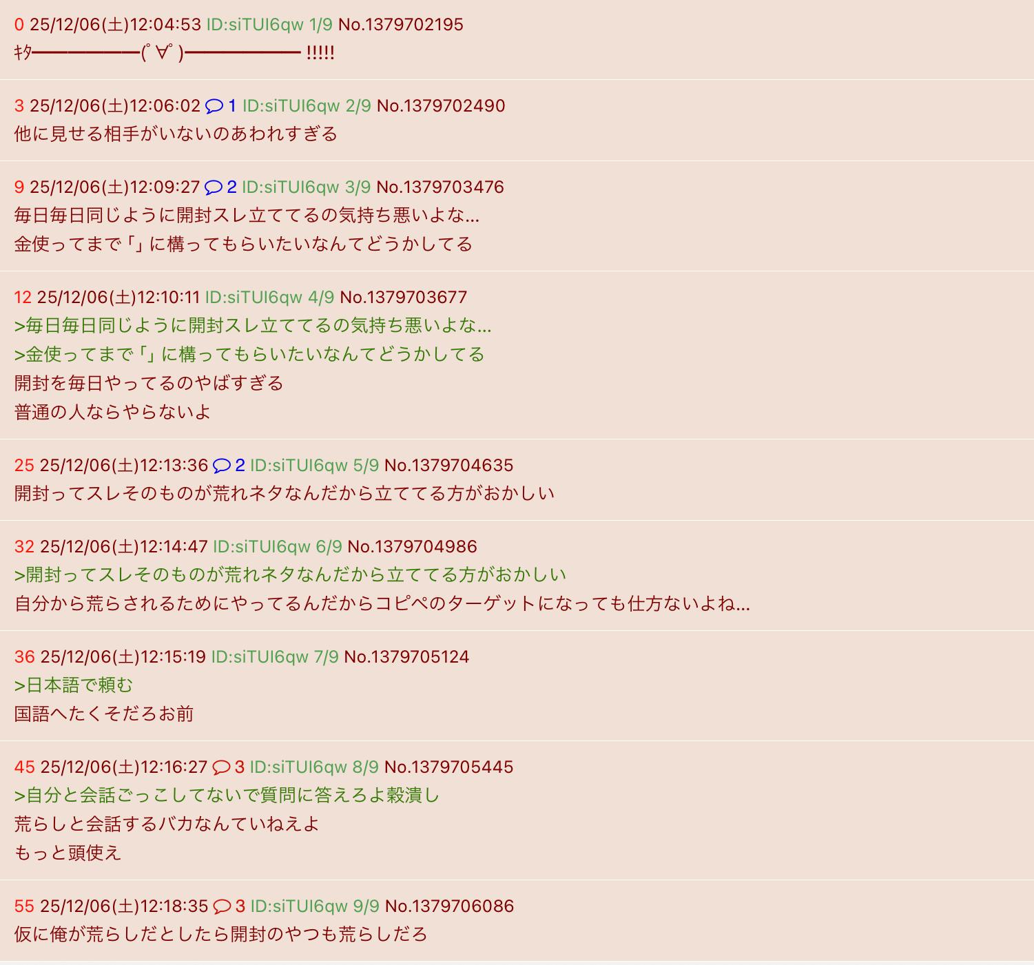 | … | 2925/12/06(土)16:25:17No.1379768242+>>そもそも開封スレってコピペ抜きにしたら全然レスが少ない雑魚スレだろ? |