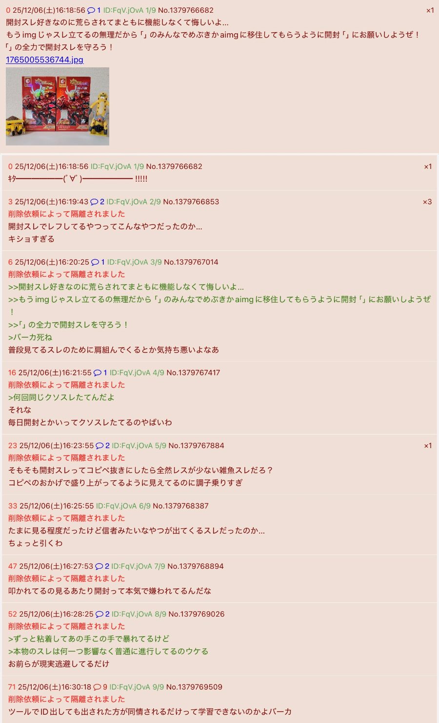 | … | 2725/12/06(土)16:24:51No.1379768131そうだねx5>そもそも開封スレってコピペ抜きにしたら全然レスが少ない雑魚スレだろ? |