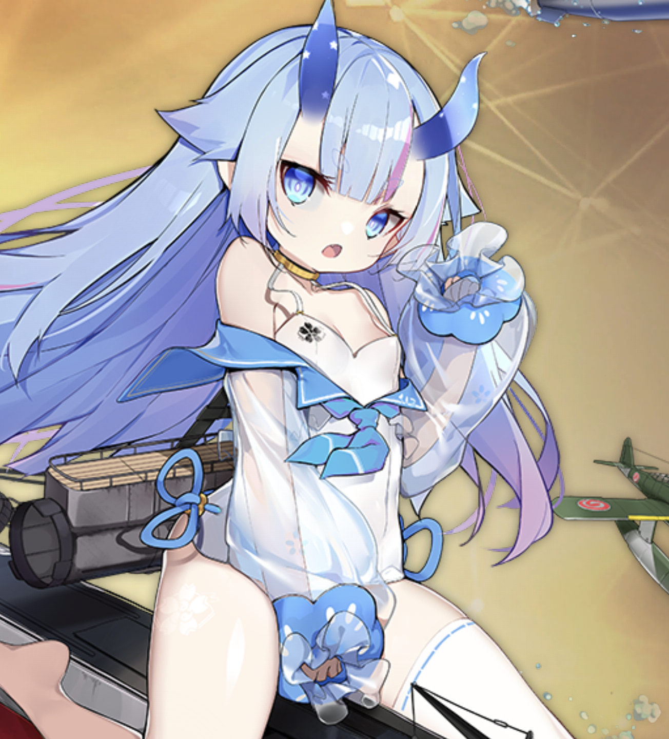 そしてこの子の青色って意味合いだと浅瀬から深海までの海の様な青のグラデーションが入ったお目々がすっごい美しいよね…思わず吸い込まれそうになるしそんな魔性の瞳しつつもお顔は可愛らしくて凄く好き…表情変えるとぴょこぴょこ動く麻呂眉やじみーに覗かせる八重歯がチャームポイントなお口可愛いよね…個人的には母港帰還時の『3』みたいな口元が1番可愛らしさポイントが高いですでも他の口元も可愛いからホント1番決めにくくて困る