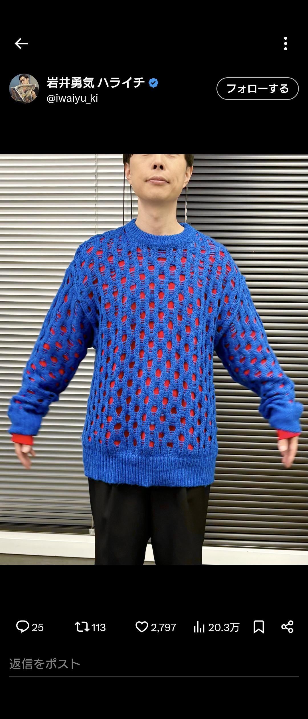 | … | 6525/12/07(日)18:11:06No.1380144405+なんでこの人蓮コラみたいな服ばっかなの?攻撃性高くない? |
