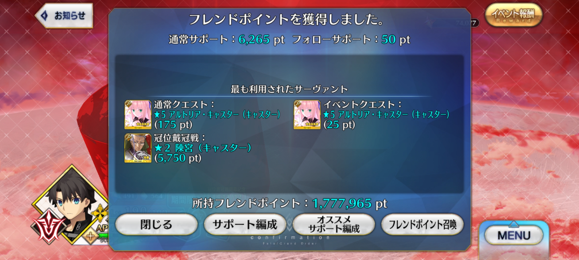 | … | 6925/12/07(日)19:14:27 ID:TnU7HOjANo.1380167250+FGO10周年に合わせて12月に入ったら終章開始まで毎日強化クエストが1日10個されるとかアホみたいなこと言ってたのも懐かしいもんじゃ |