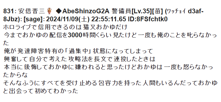 | … | 8325/12/07(日)19:28:44No.1380173396そうだねx9>最近ホロライブ粘着失敗したから頭おかしくなってるホロ粘着がいるのよ |