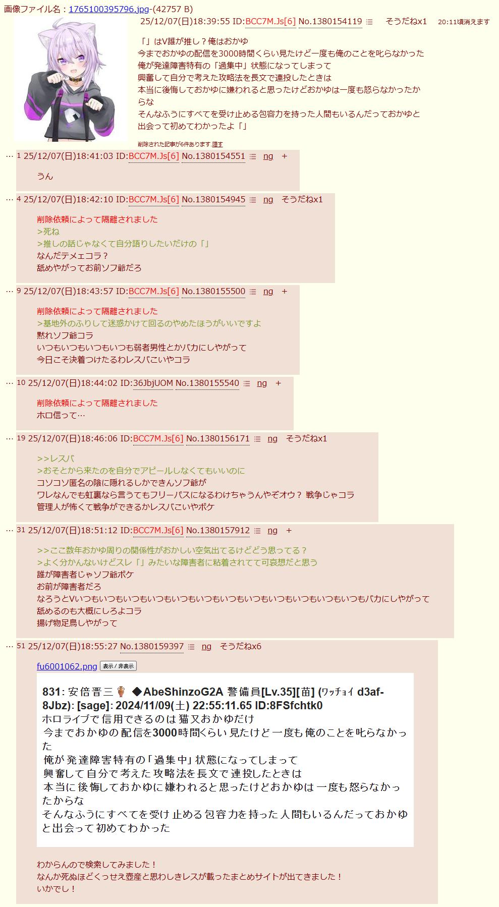 | … | 8825/12/07(日)19:39:33No.1380178372そうだねx3>最近ホロライブ粘着失敗したから頭おかしくなってるホロ粘着がいるのよ |