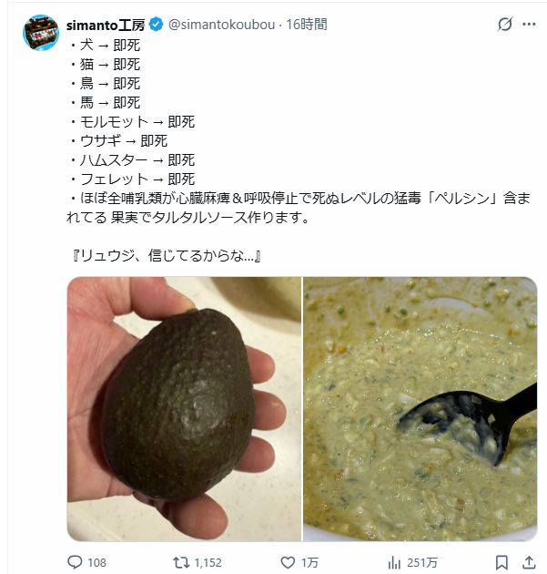 | … | 23225/12/08(月)13:15:10No.1380396158+犬にアボカドが禁忌って話は30年ぐらい前のアボカドを常食してた犬が死んだ2例だけの報告で禁忌リスト入りしてるだけで |