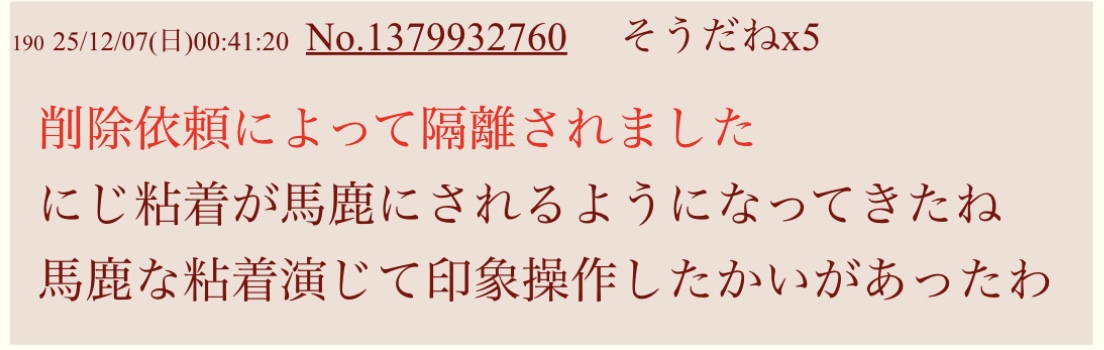 | … | 60625/12/08(月)22:00:55No.1380546047そうだねx5スレ潰しや嫌がらせやりたいなら無機質にコピペだけしてたらいいのに |