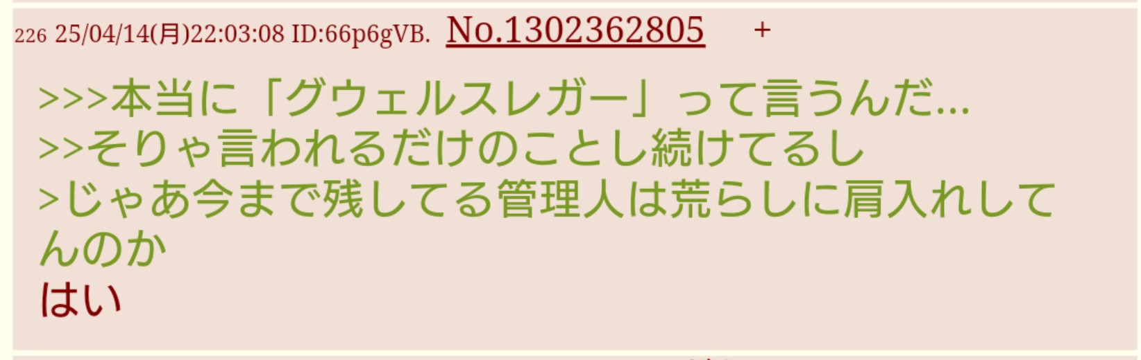 | … | 6025/12/08(月)21:14:20No.1380525762そうだねx6>そもそもimgのなーと新板提案だか準備板のなーではだいぶ違うくね? |