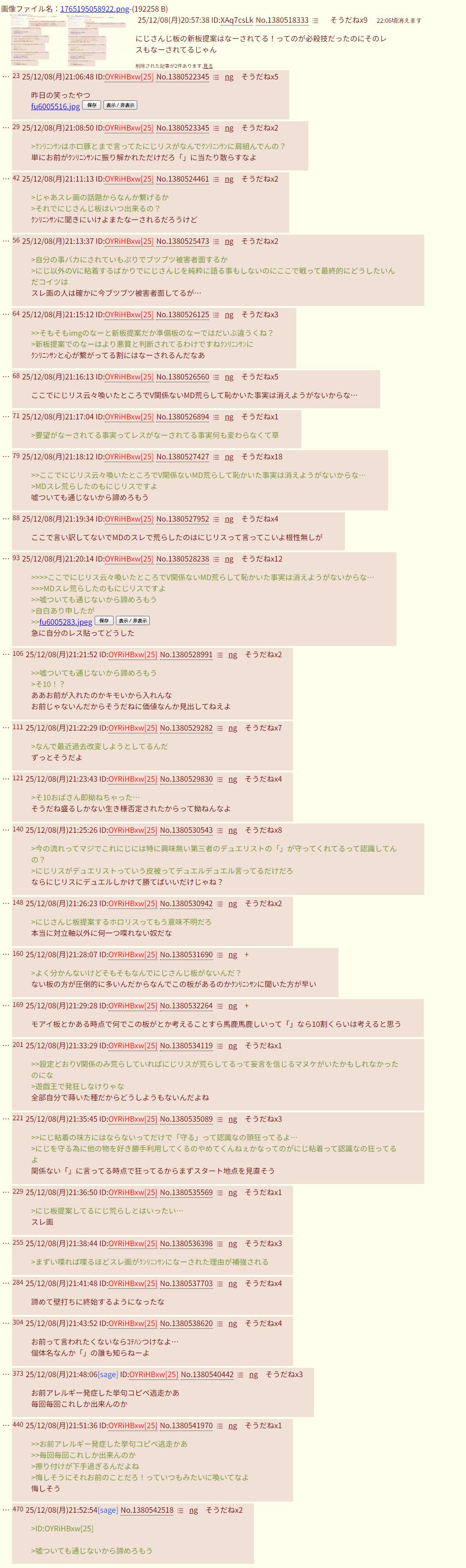 | … | 56225/12/08(月)21:57:52No.1380544755+酷くなったにじリスが荒らして |