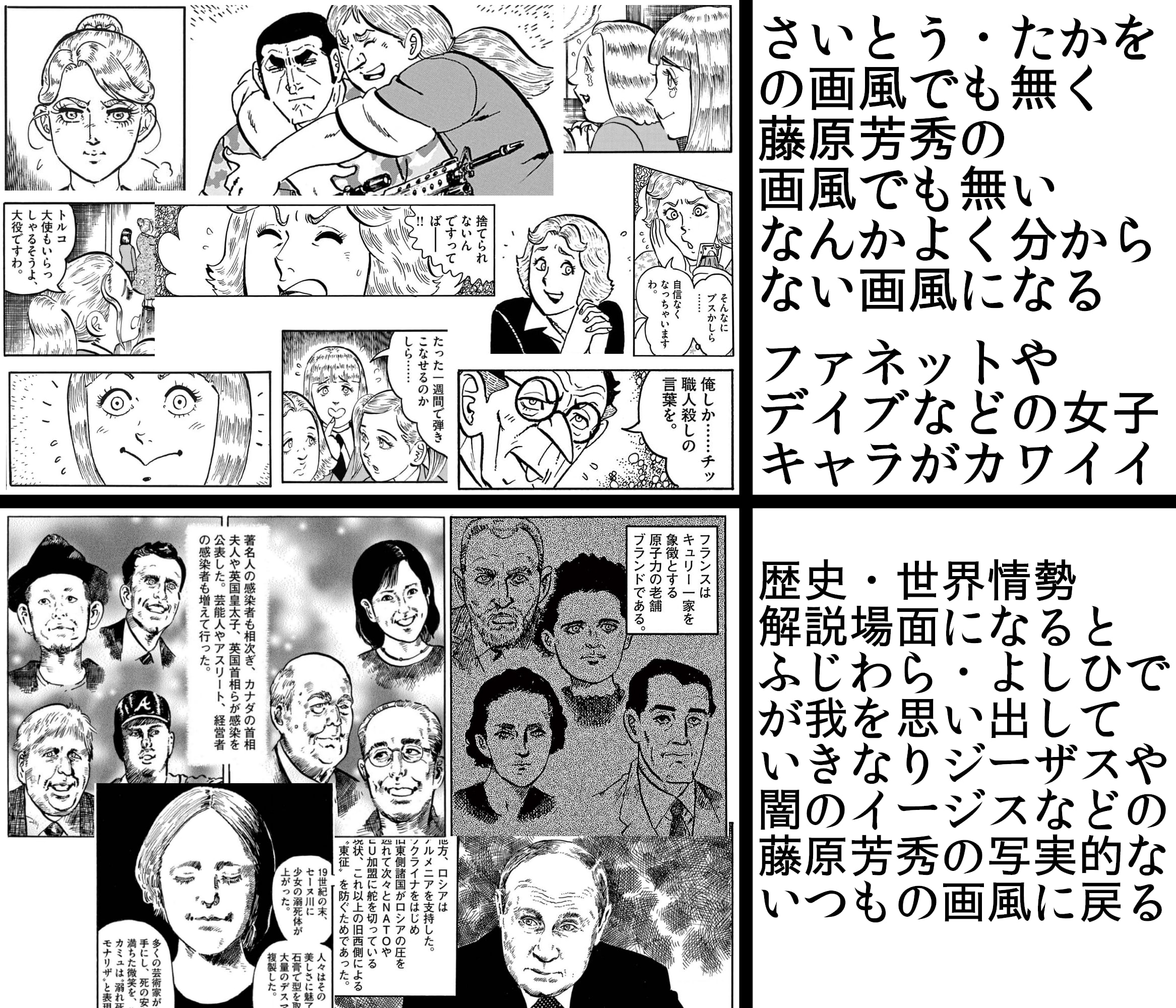 | … | 525/12/09(火)00:04:50No.1380601390そうだねx42無理矢理さいとうプロっぽい画風にしているので藤原芳秀先生の画力を生かせていないのは確か |