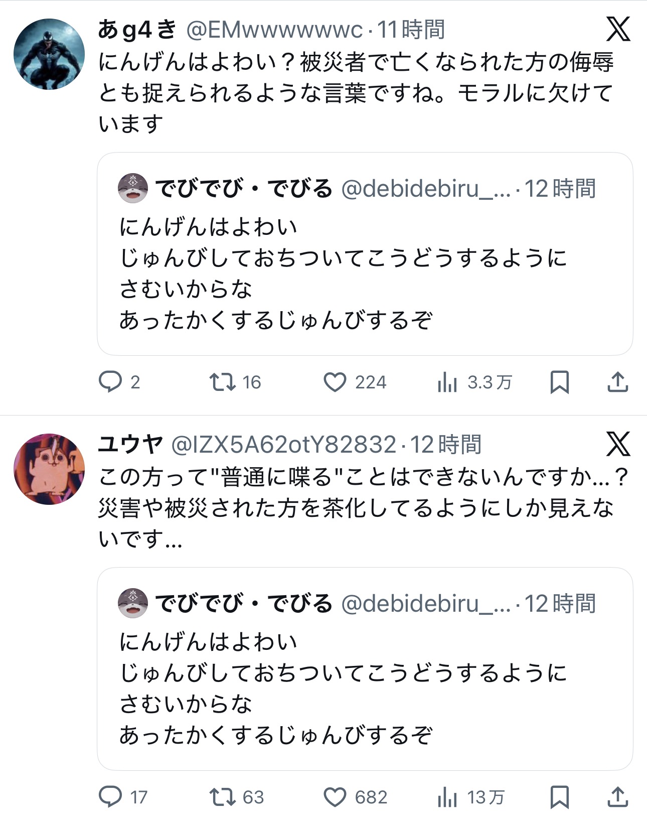 | … | 7225/12/09(火)14:30:52No.1380724699そうだねx8>真偽不明だから騒ぐなは他所の話の時にそれが言えたら良かったねって何度… |