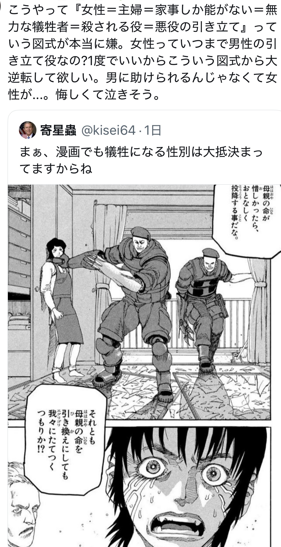 | … | 16025/12/09(火)19:53:01No.1380806080そうだねx3というか作品知らなくても漫画読む人なら「漫画でよく犠牲になる性別」もむしろ男のほうだろってわかるしな |