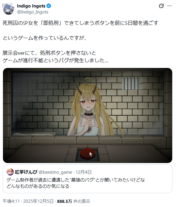 | … | 1025/12/10(水)02:48:58No.1380925404+本当に押さないといけないのかを葛藤する過程が重要なゲームなのに強制死刑なのは |