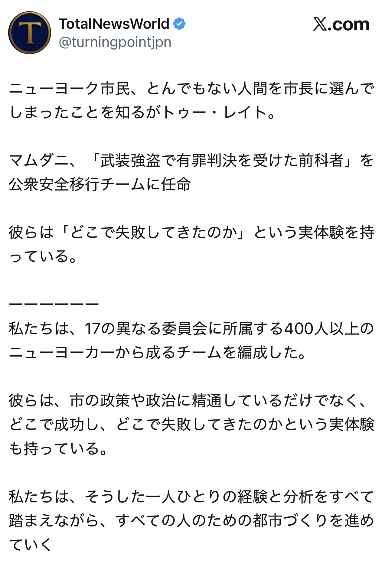 | … | 1125/12/10(水)20:03:31No.1381111212そうだねx4>マムダニは警察解体しようとしてるやつなので… |