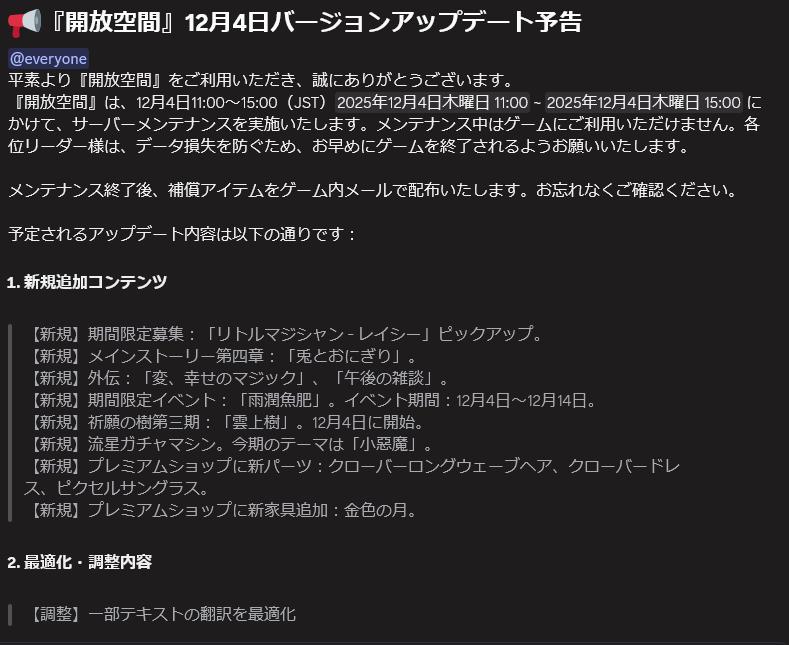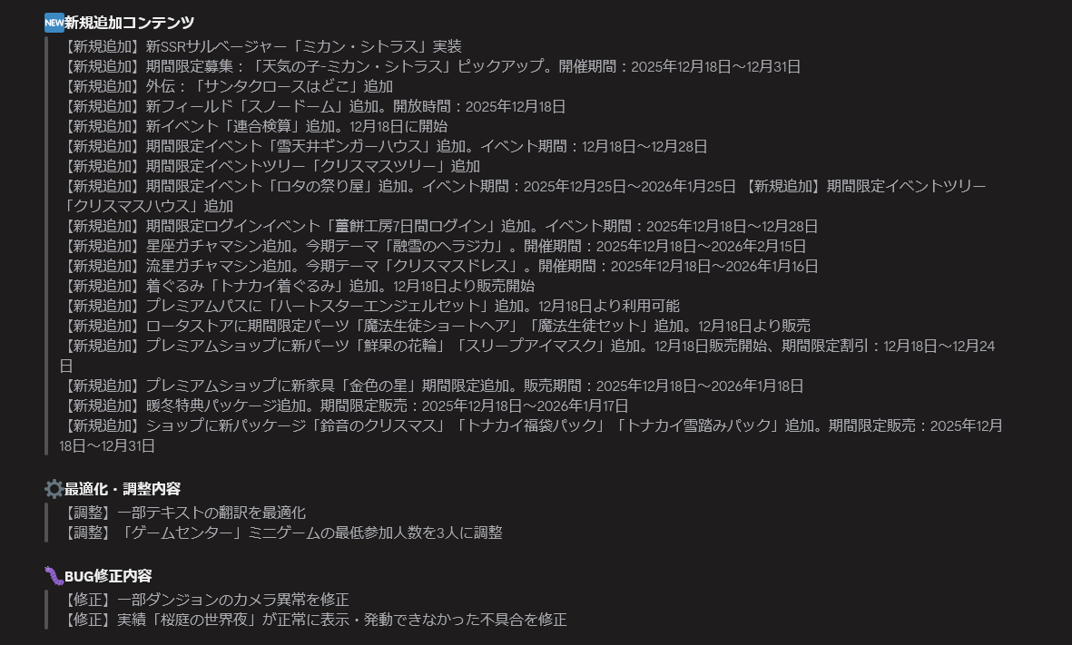 | … | 3325/12/10(水)21:16:41No.1381140674+アプデは明日だけど色々始まるのは来週からなんだね |