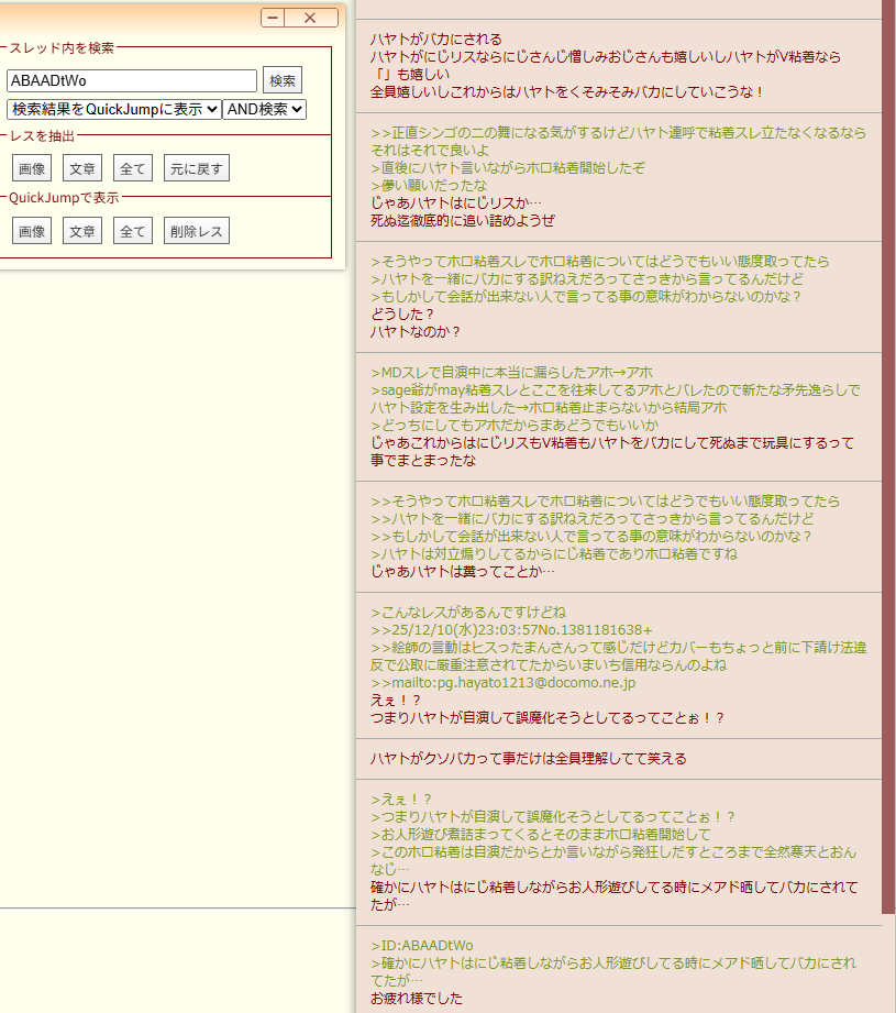| … | 52625/12/10(水)23:31:31No.1381191955そうだねx2pg.hayato1213@docomo.ne.jpとメール欄に入れてハヤトとやらをバカにするのは勝手にすりゃいいけど |