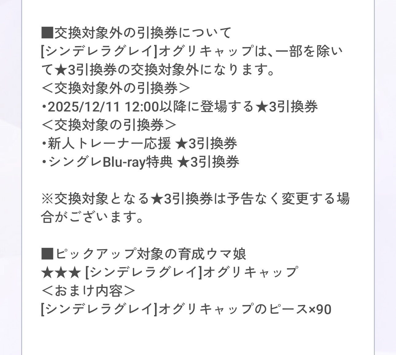 | … | 4725/12/11(木)06:55:38No.1381246411+>なんで今回のオグリさんほぼ限定枠になってるんですかね? |