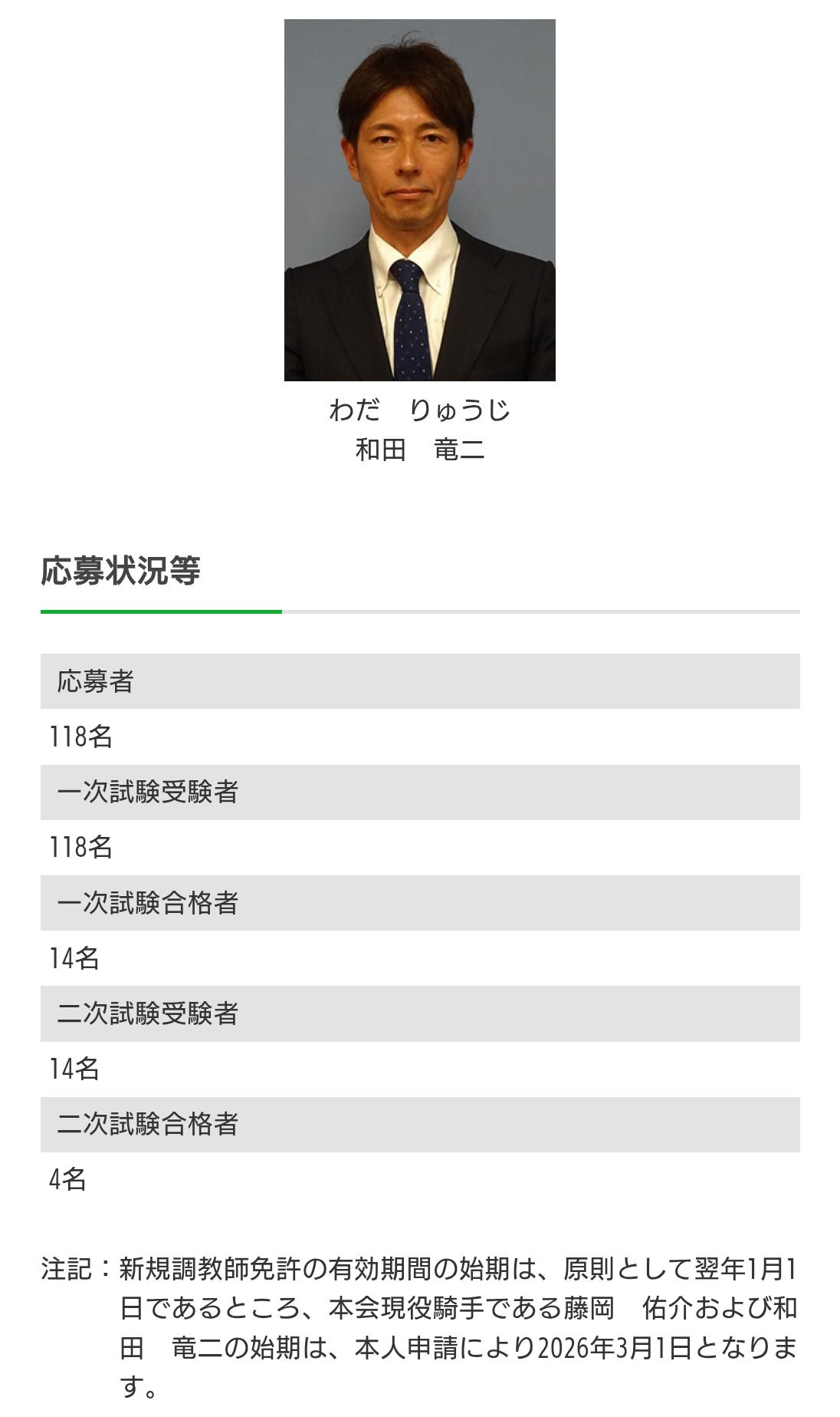 | … | 1225/12/11(木)10:16:49No.1381278405そうだねx28>注記:新規調教師免許の有効期間の始期は、原則として翌年1月1日であるところ、本会現役騎手である藤岡 佑介および和田 竜二の始期は、本人申請により2026年3月1日となります。 |