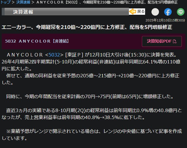 | … | 2825/12/11(木)09:32:46No.1381269809そうだねx9>増配の事実書いてあるだけの記事見て提灯記事だと思うのはどういう生き方したらそうなるんだよ |