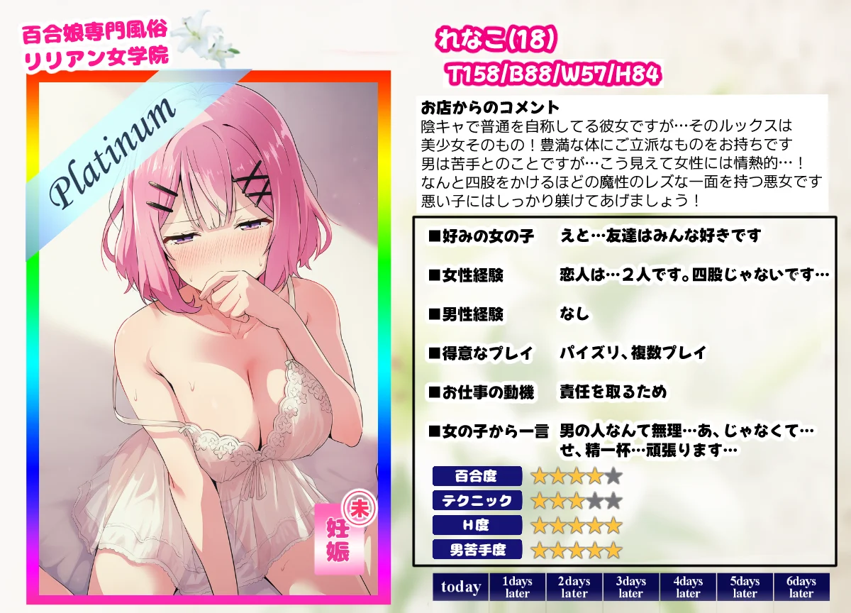 | … | 925/12/11(木)15:28:03No.1381351165そうだねx4百合っ子に男の相手させる風俗? |