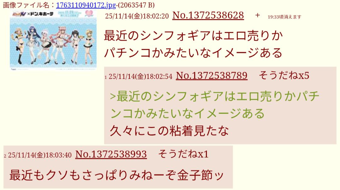| … | 525/12/11(木)18:28:51No.1381398561そうだねx1最近シンフォギアこういうの出してる? |