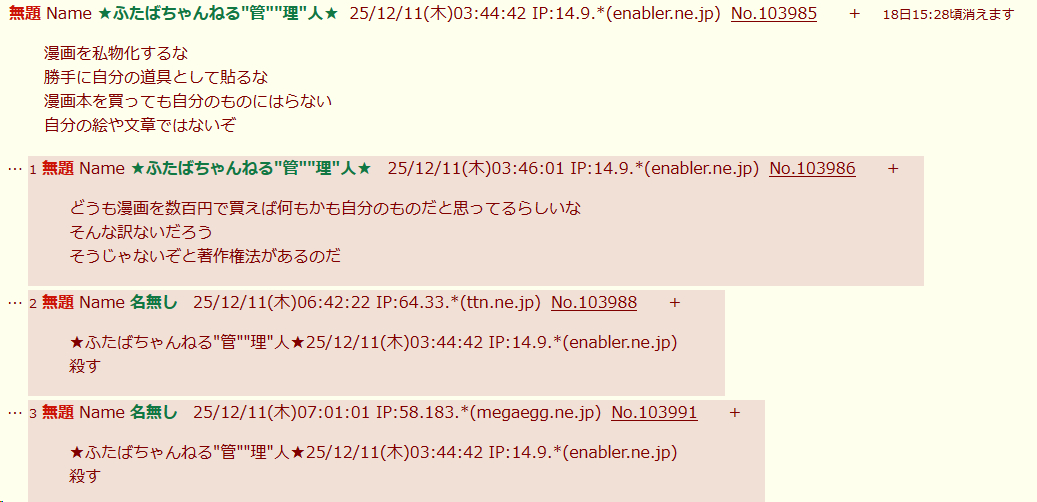 | … | 925/12/11(木)20:06:39No.1381431556そうだねx3管理人って書いてあるし… |