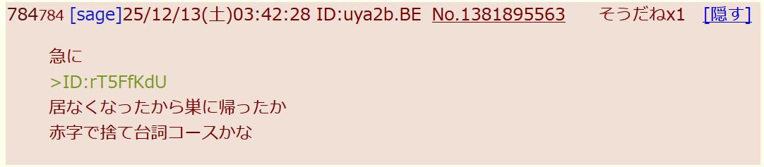 | … | 1025/12/13(土)09:27:40No.1381925915そうだねx3ハヤトはアンチスレ立てられて拗ねてるから来ないよ |