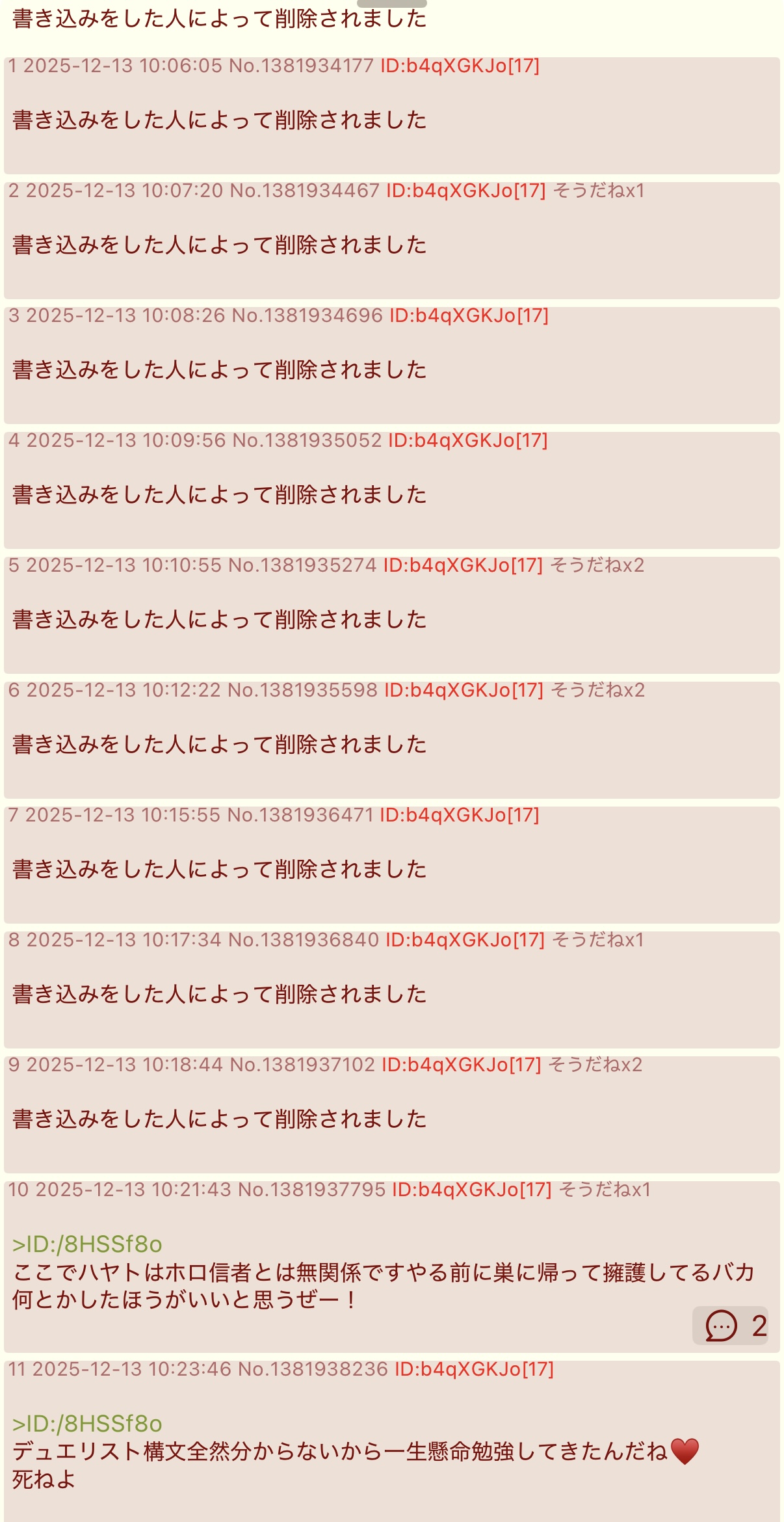 | … | 56025/12/13(土)11:13:17No.1381949198+ハヤトこんなに祝ってもらっておいてありがとうの一言も言えないのか |