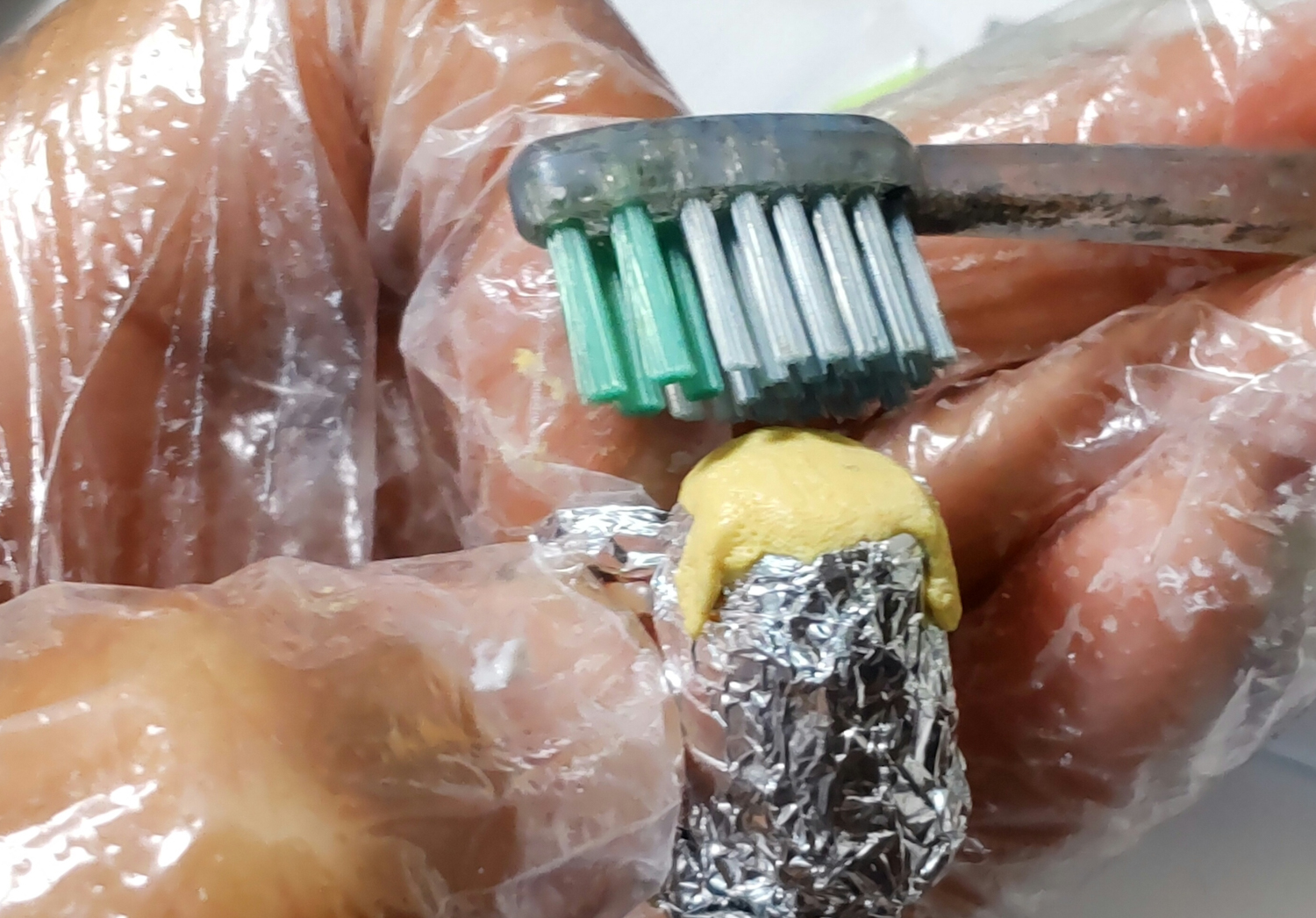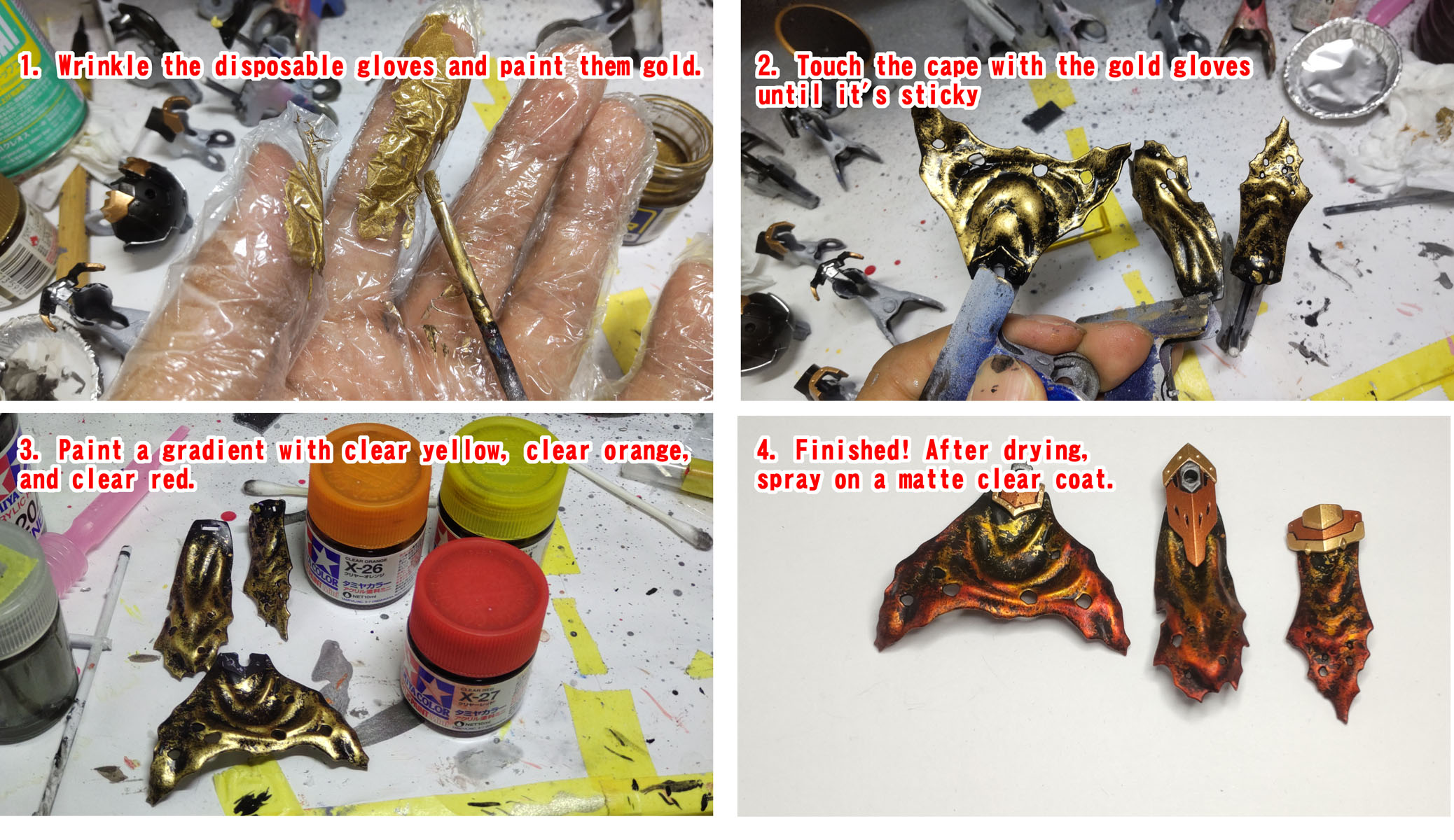 キッチン手袋をはめて金塗料を塗ってパーツをペタペタ 乾いてから水性のクリアーレッドやオレンジでブレンディング あとはつや消しコート |