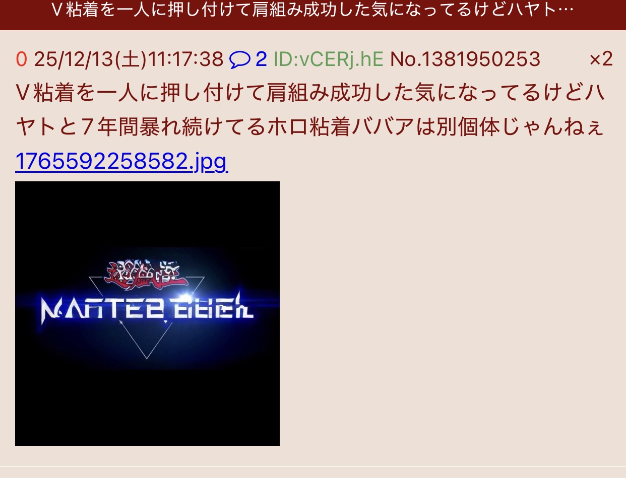 | … | 4025/12/13(土)20:02:46No.1382123449そうだねx4今日はにじさんじ大会の話してもいいのか!? |