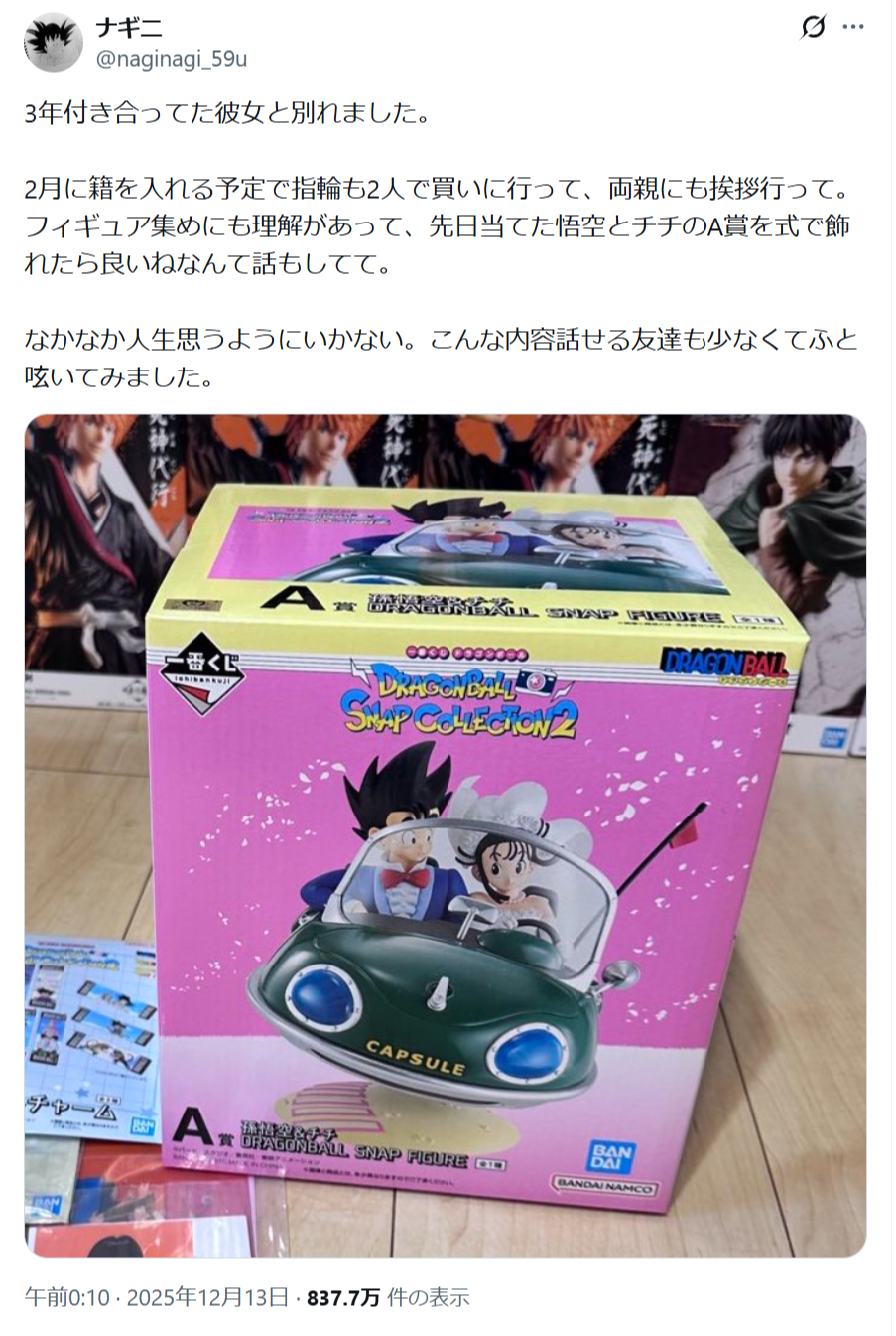 | … | 3425/12/13(土)21:04:33No.1382150044+同じフィギュア三つも並べてる時点でフラれた理由丸わかりなような |