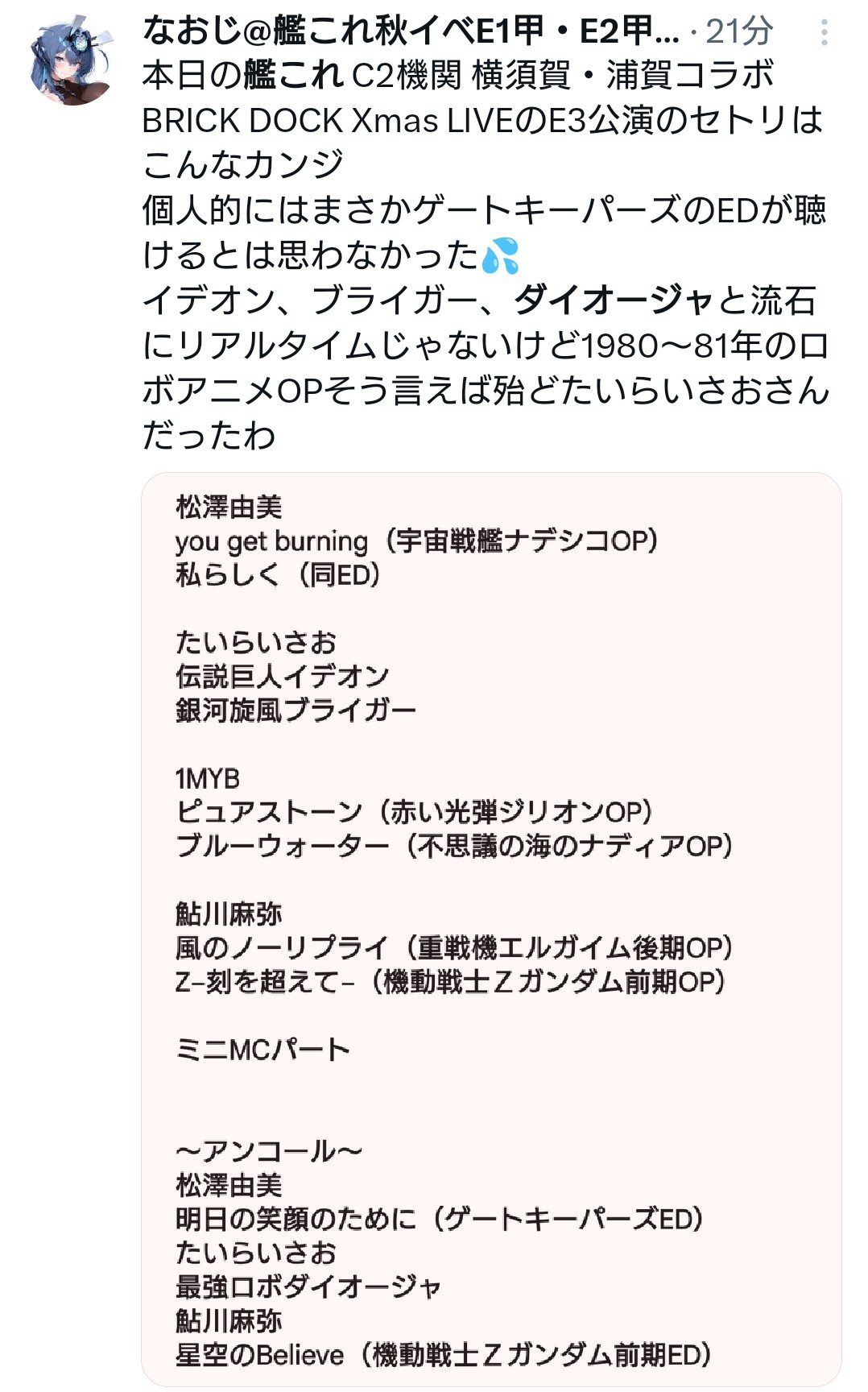| … | 6325/12/13(土)21:41:11No.1382166801+正月にやるライブでも大昔のアニメの曲必ず一つは入れるからそういうもんなんだろう |