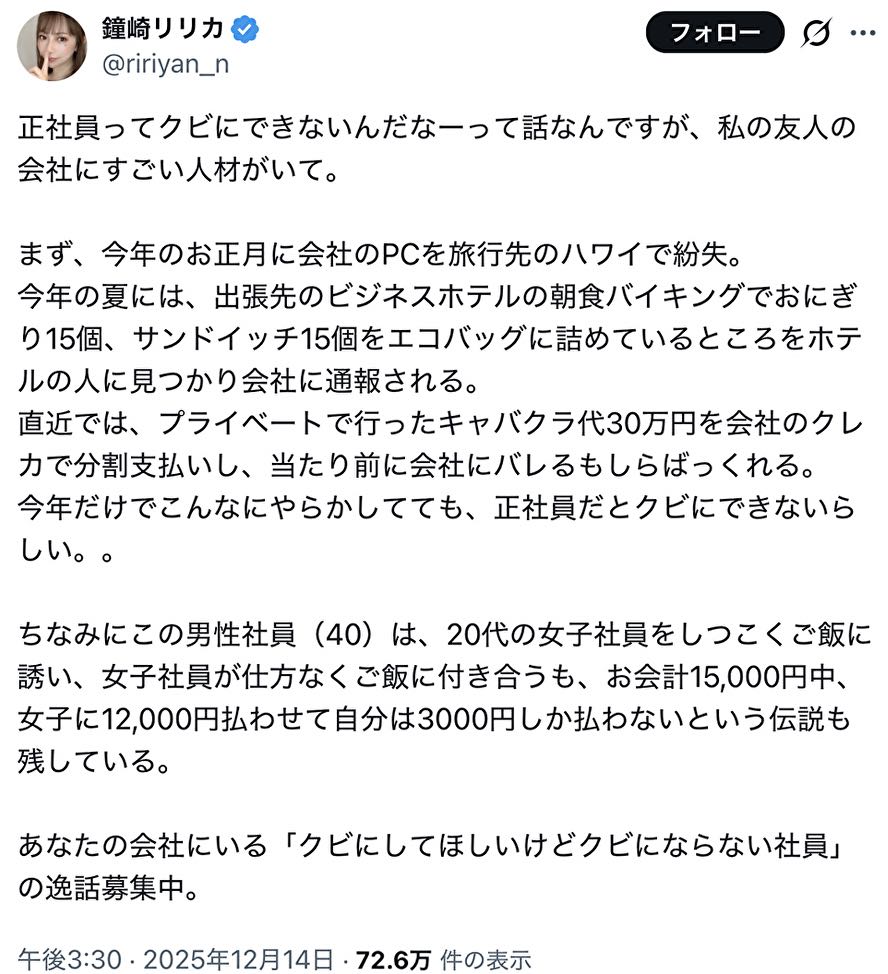 | … | 5025/12/14(日)20:22:07No.1382517889+首にしても訴えられたときにこういう裏付けがありますと理論武装してないとまぁ難しいだろう |